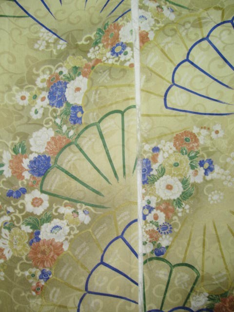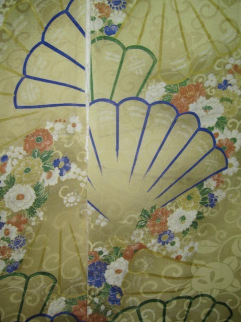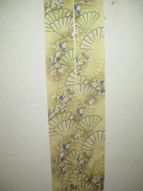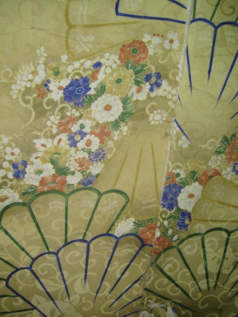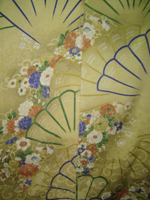 着物古布=27★黄色*扇*薔薇*牡丹*桜*菊*唐草模様*綸子*羽織*古布はぎれ★人形/吊るし雛
