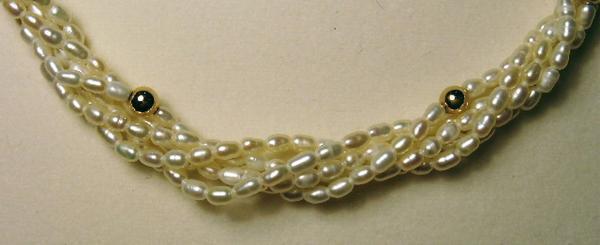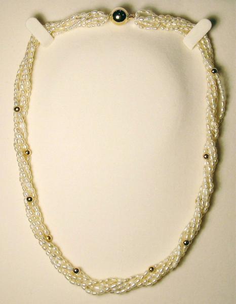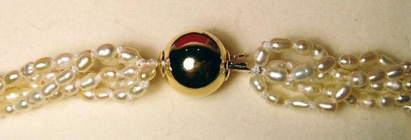 5連の淡水ライスパールに、15個のK14丸玉を全体に配し、エレガントでデラックスなオシャレが楽しめます。