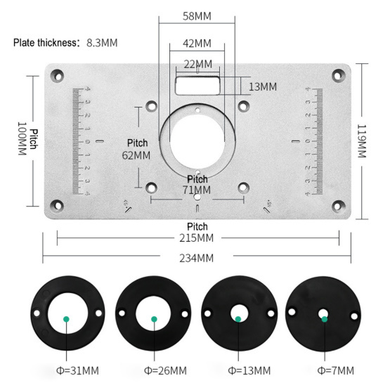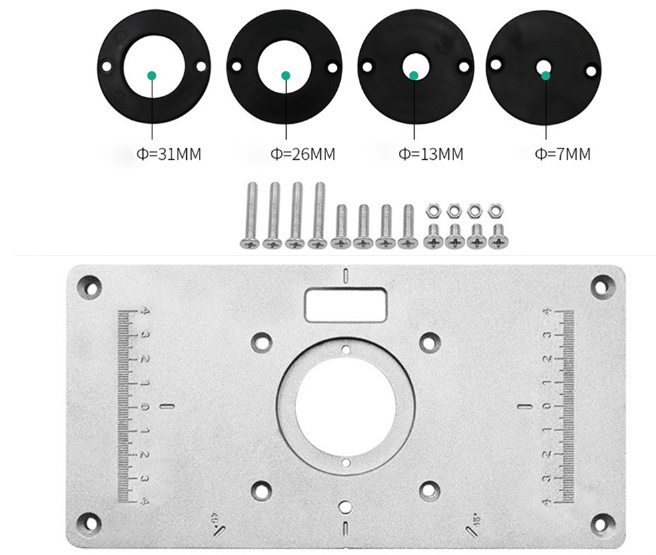 | 【商品説明】 ルーターテーブルプレート ルーターベース 挿入リング付き ◎ルータープレート 1個 ◎挿入リング 4個 ◎取付ネジ 1セット | ||