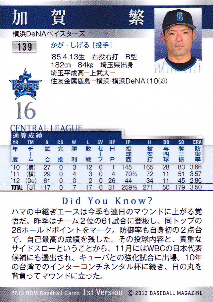 BBM2013ベースボールカード1st 139 加賀繁 埼玉県 埼玉平成高校 上武大学 住友金属 横浜DeNAベイスターズ