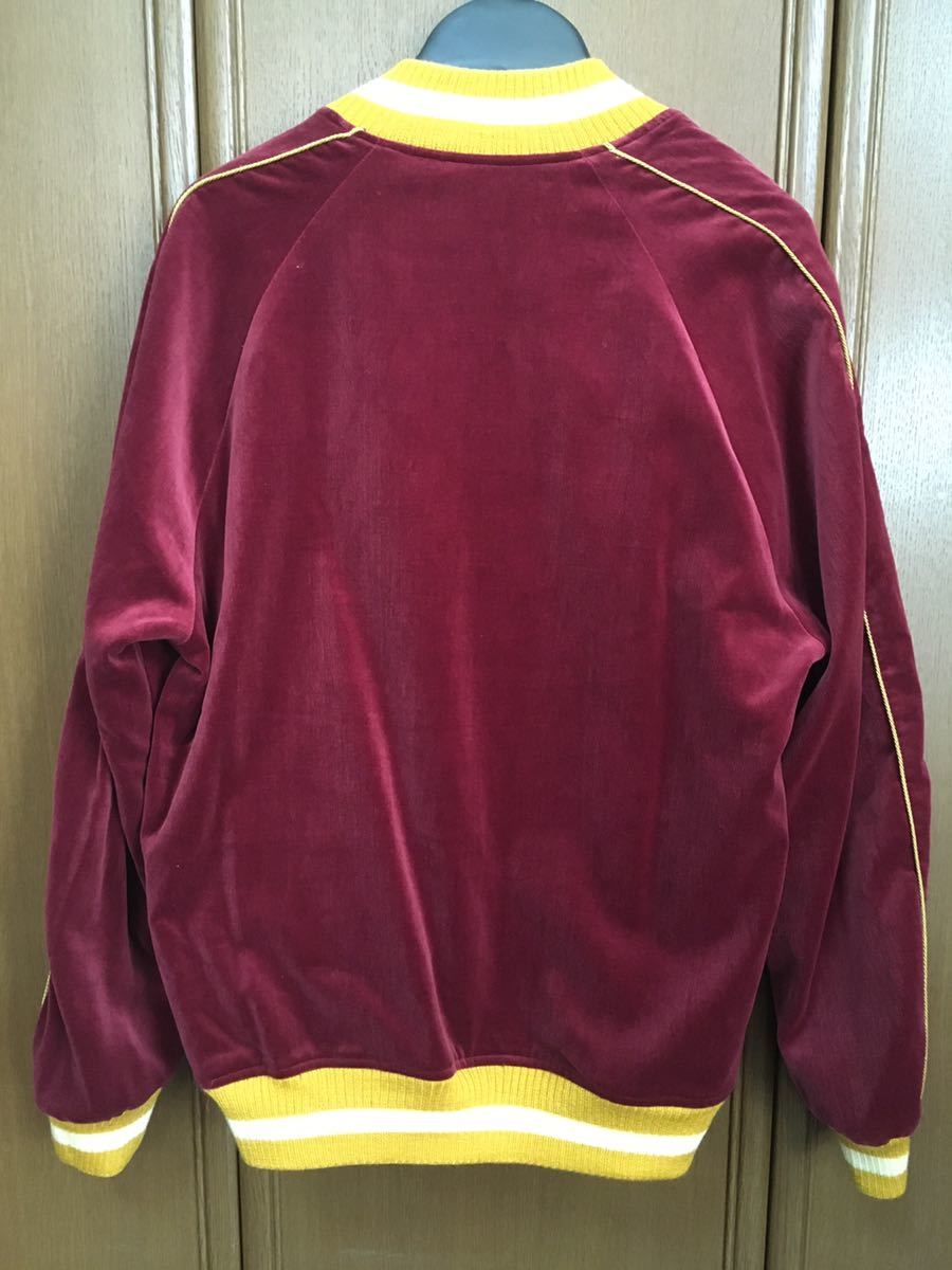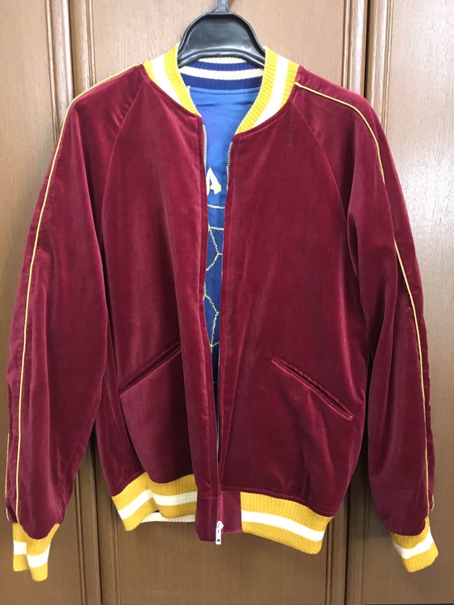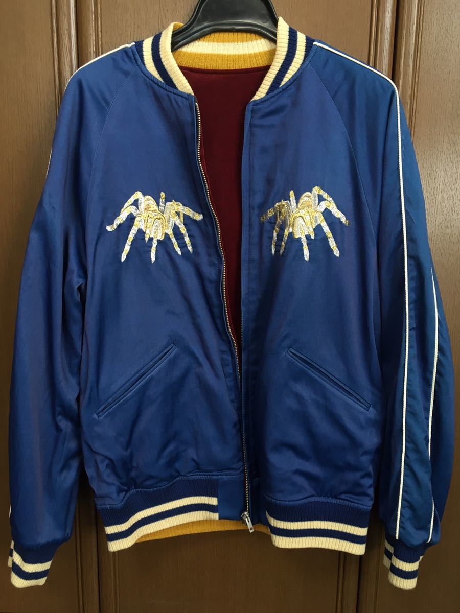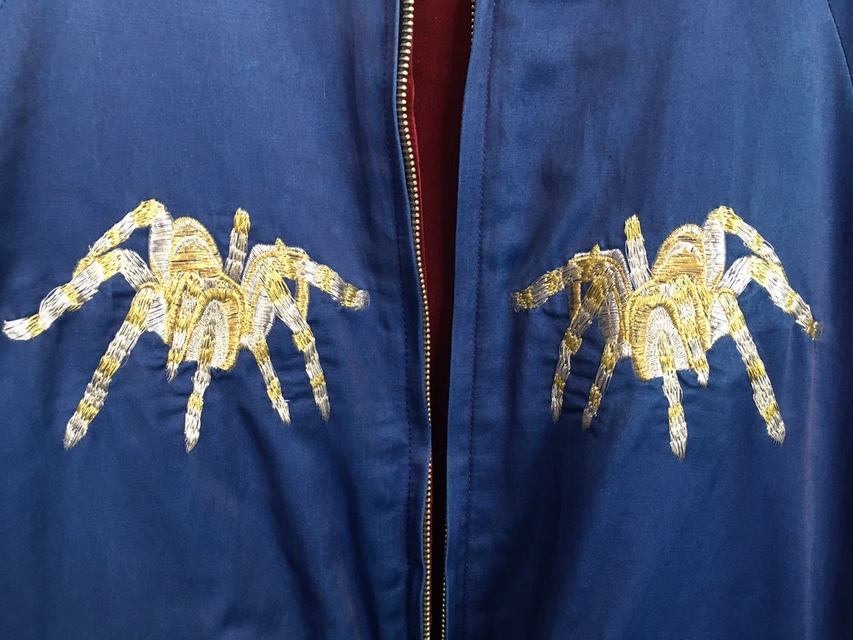 サテン生地にインディゴ染めした独特の光沢感があります。胸に蜘蛛、バックに蜘蛛の巣(SPIDER WEB)の刺繍があり、バーガンディー面は別珍です。
