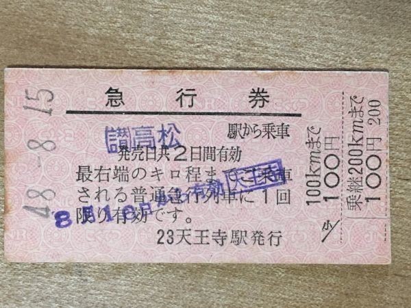 硬券 204 急行券 (讃)高松駅から乗車 乗継200Kmまで 昭和48年 天王寺駅発行 NO.03073