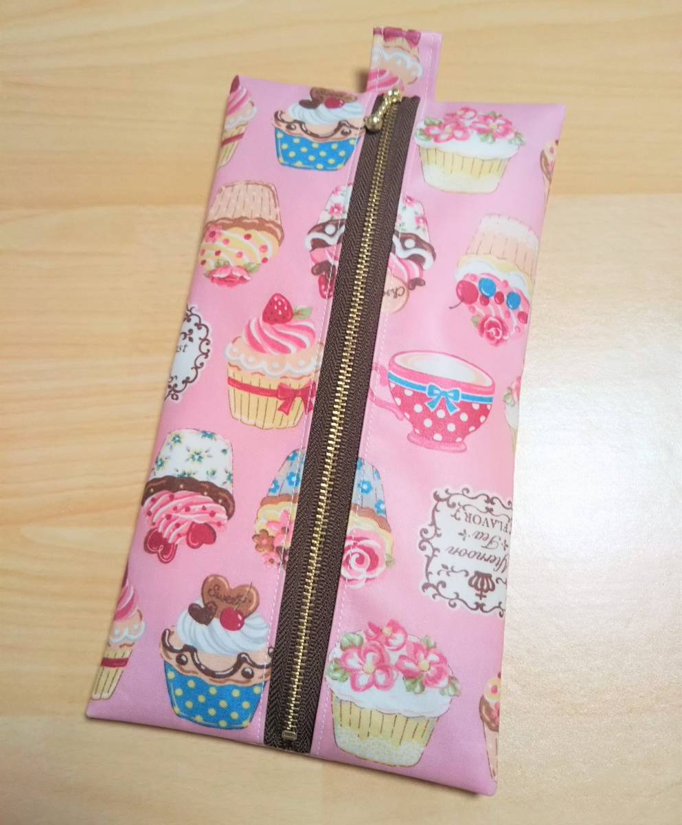 <ティッシュケース(ファスナー)>ミニョンケーキ柄淡ピンク◆花粉症◆ハンドメイド◆ラミネート加工