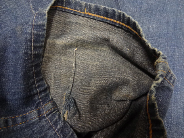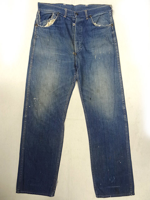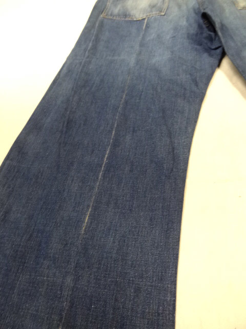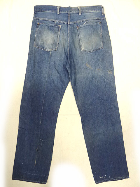 コンディション:年代相応の風合いです。コインポケットは生地がないのでリペアは可能ですが,違う生地が必要になるかと思います。個人的にはコインポケットと呼ばれるわりには私も含め,誰もコインを入れる人はいないので特に問題はないかと思います。擦れによる小さい穴などは数か所ありますがどれもリペア可能程度です。画像7のように左足後側のみつまんで縫われています。理由はわかりませんが約1センチ未満がつまんであります。元に戻すことは可能そうですが,無理に戻してミシン穴から破れへとなってしまうよりは,着用しても肉眼でわかるほどの差は左右で見られないのでそのままでもいいのではないかと思います。その他致命的なダメージはなく,ありがちなレングスが短くされているということもなく,これだけ長めで残っているものはかなりレアです。背の高い人でレングスで泣いていた人にはうってつけかと思います