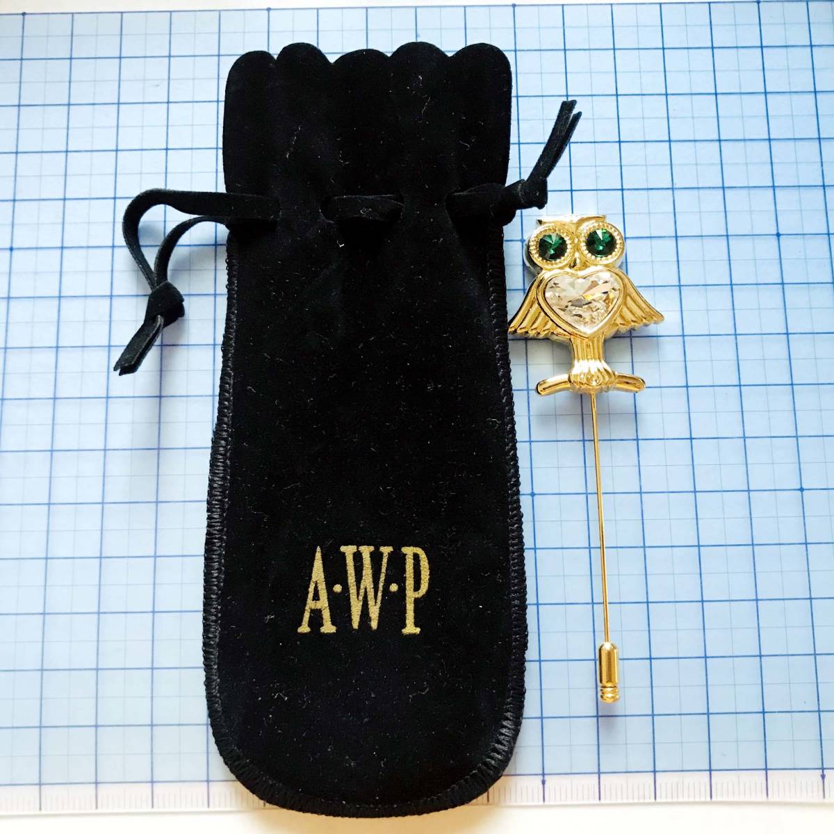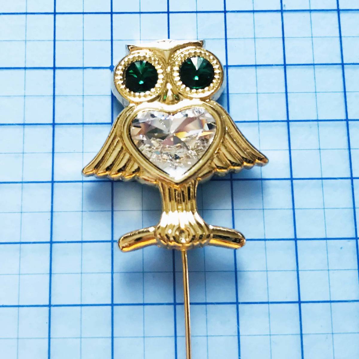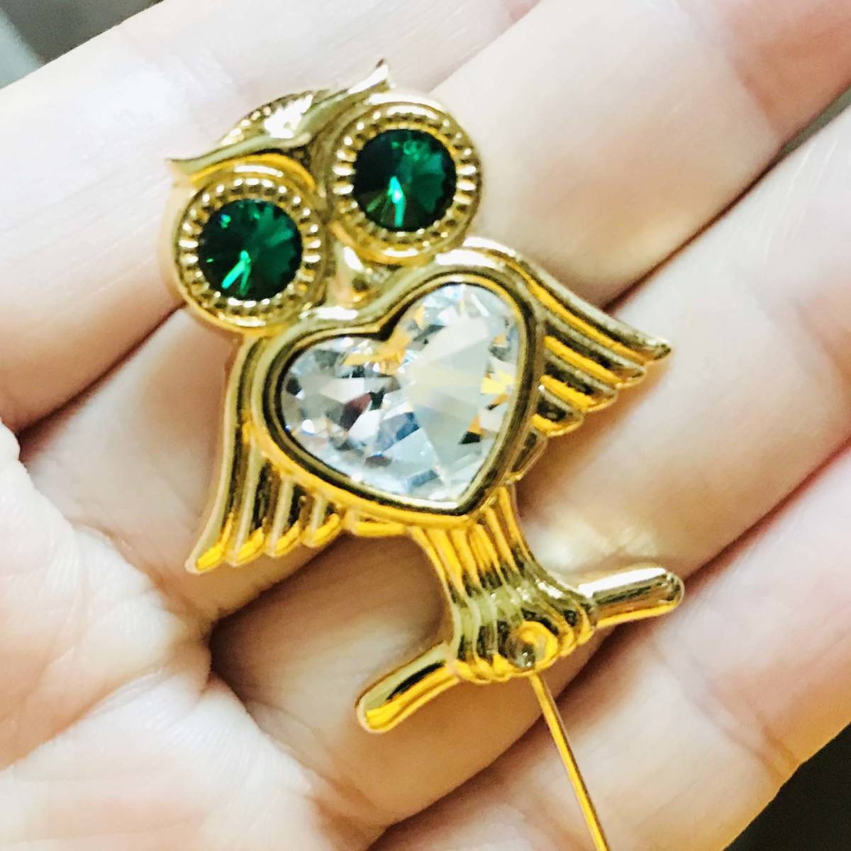 保管品未使用 A.W.P エメラルド風 ラインストーン フクロウ 福招き ゴールド ピンブローチ 保管袋付き NO.S324