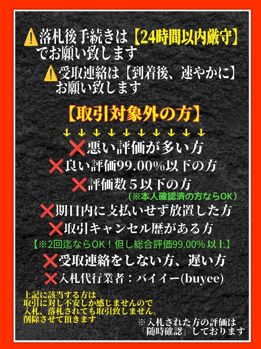等、上記に当てはまる方は取引に対し不安しか感じませんので入札及び落札されても取引は致しません。削除させて頂きます