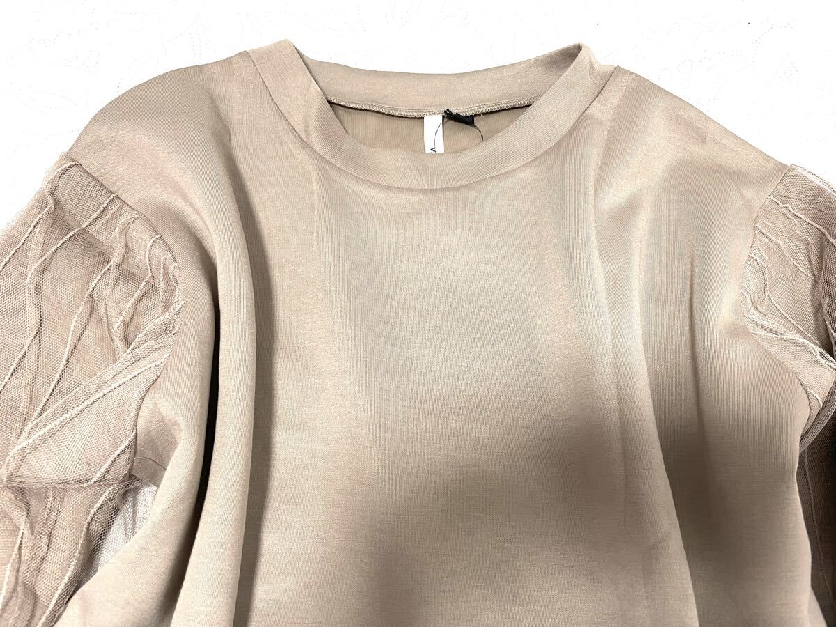 ●きれいめカジュアル*ドロップショルダー*袖チュール異素材ルオーバーTops*綺麗シルエットです。