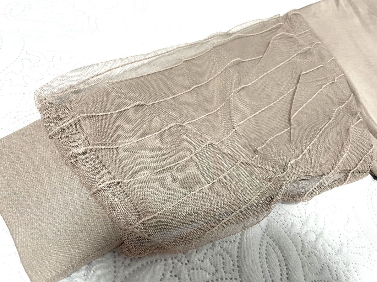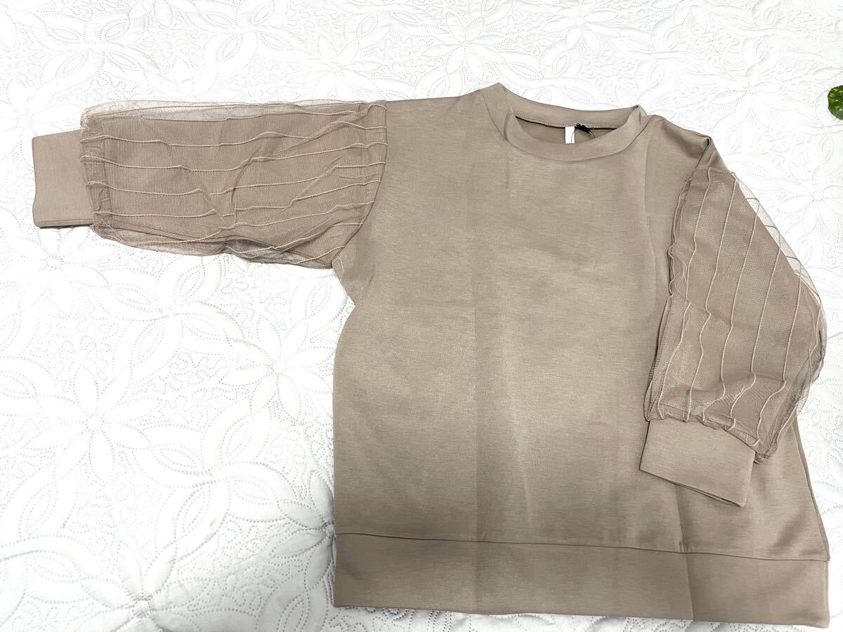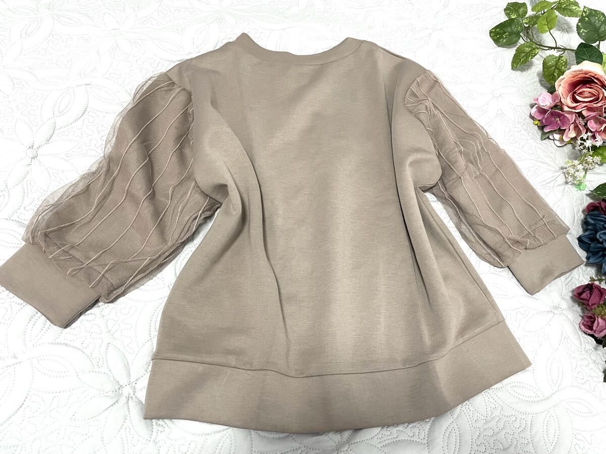 f■3L■新品■きれいめカジュアル*ドロップショルダー二の腕ゆったり*袖チュール異素材ルオーバーTops*綺麗シルエット■モカ