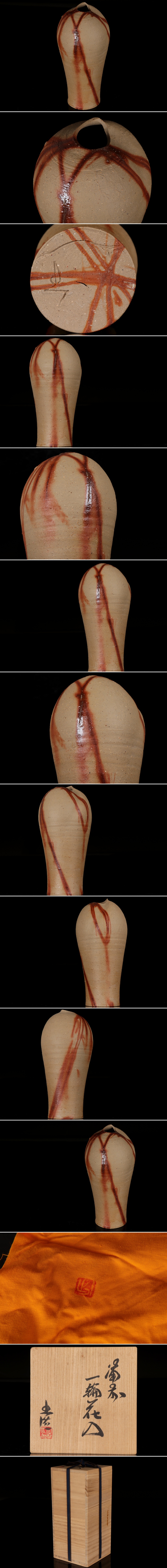 人間国宝山本陶秀氏の四男。武蔵野美術大学彫刻科卒業後、パリ国立美術学校彫刻科に留学。帰国後山本陶秀氏に師事し、1975年伊部に築窯し独立。積上、出彩、叩込など独自の技法で備前焼の可能性を拡げるべく活躍されている山本出氏。陶秀氏の伝統と技を引き継ぐ、作者独自の成形から生まれた立体感のある見事な造形に、輝きの緋襷窯変が美しく競演している。山本出氏の備前焼一輪花入。