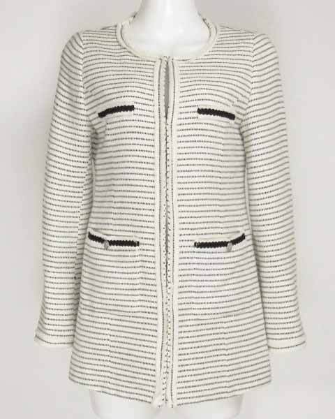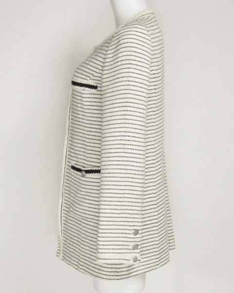 | すっきりシンプル、清楚なスタイル☆ 首周りから前身頃、袖、ポケットにフリンジがあり、 きちんと感がありますよ♪ スリット糸で上品な輝きがございます。 首元裏に汚れがございます。 アームホールに薄汚れがございます。 裏地に引きつれがございます。 全体の所々に点汚れがございます。 両袖にホツレがございます。 実寸 着丈約67cm 肩幅約37cm バスト約88cm 袖丈約60cm 【サイズ】:(2) 【素 材】:(表/綿77%レーヨン20%ポリエステル2%キュプラ1%、裏/ポリエステル100%) 【 色 】:(白、黒) 【程 度】:(B) 管理番号 7167-20160315-001 355 001 | ||||