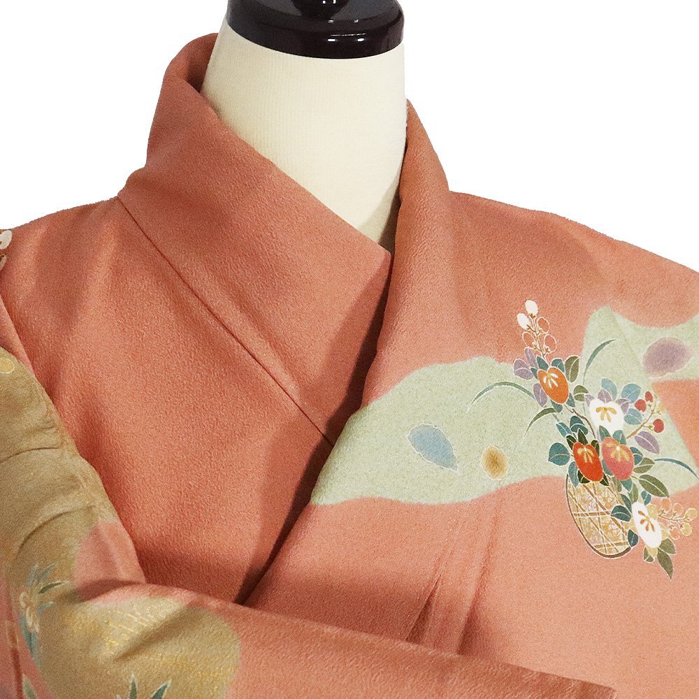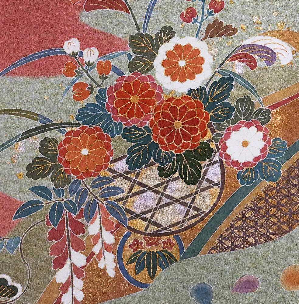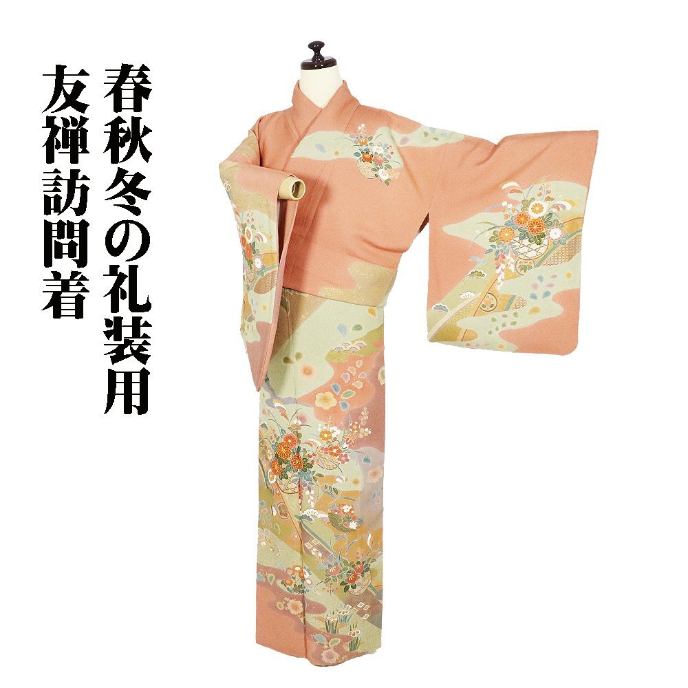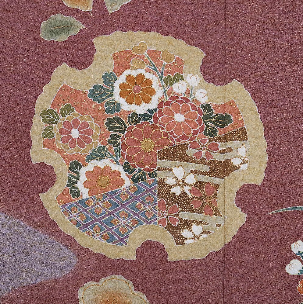 | 商品 | 友禅訪問着 袷 丹後縮緬地 ピンク(薄葡萄色)・赤紫(蘇芳香色)・緑(山葵色)・金箔地 花籠 菊・松竹梅・桜・橘・菖蒲 161 広襟 作家落款入り |