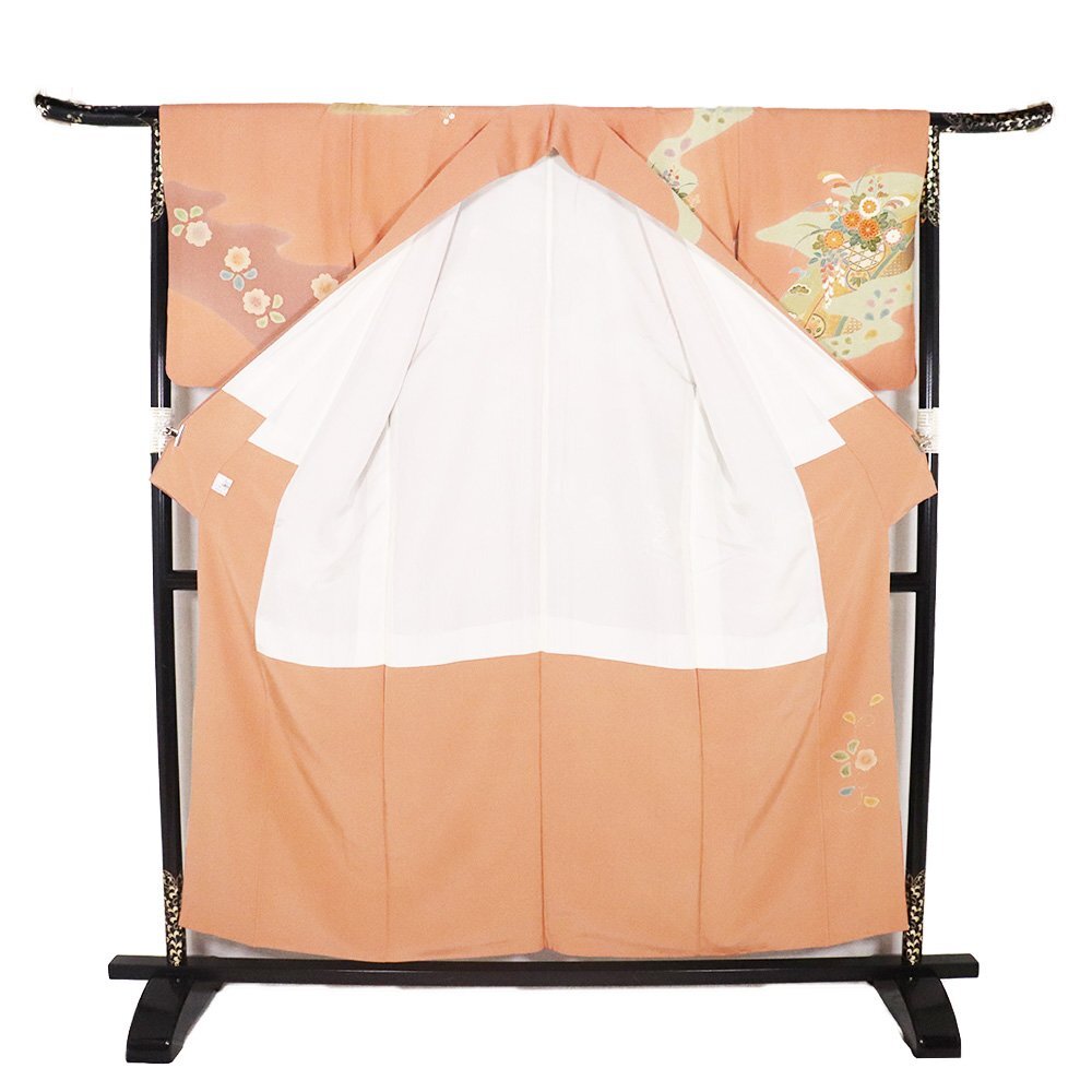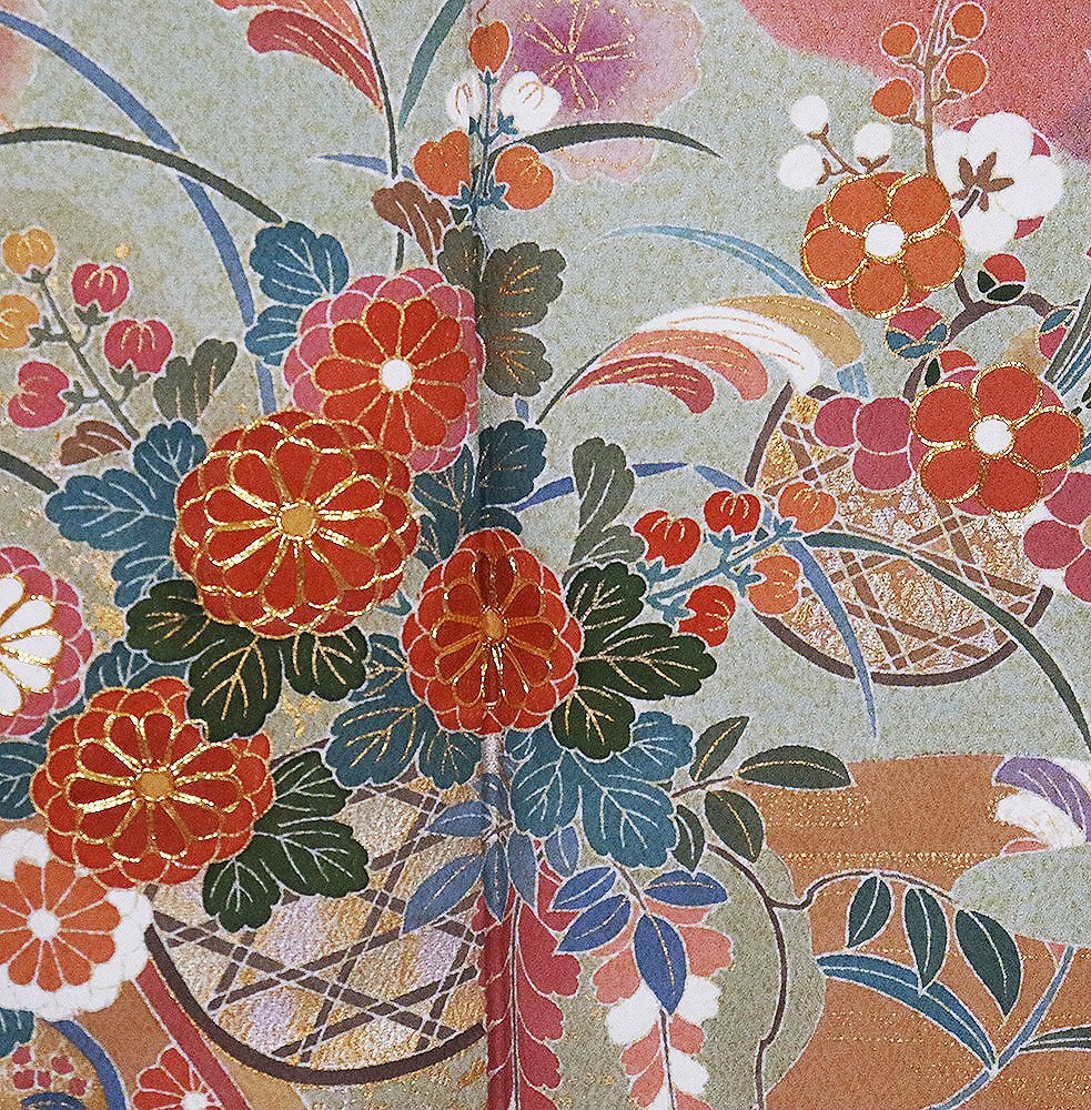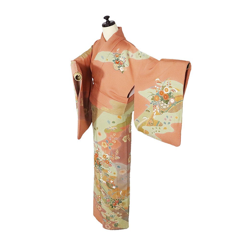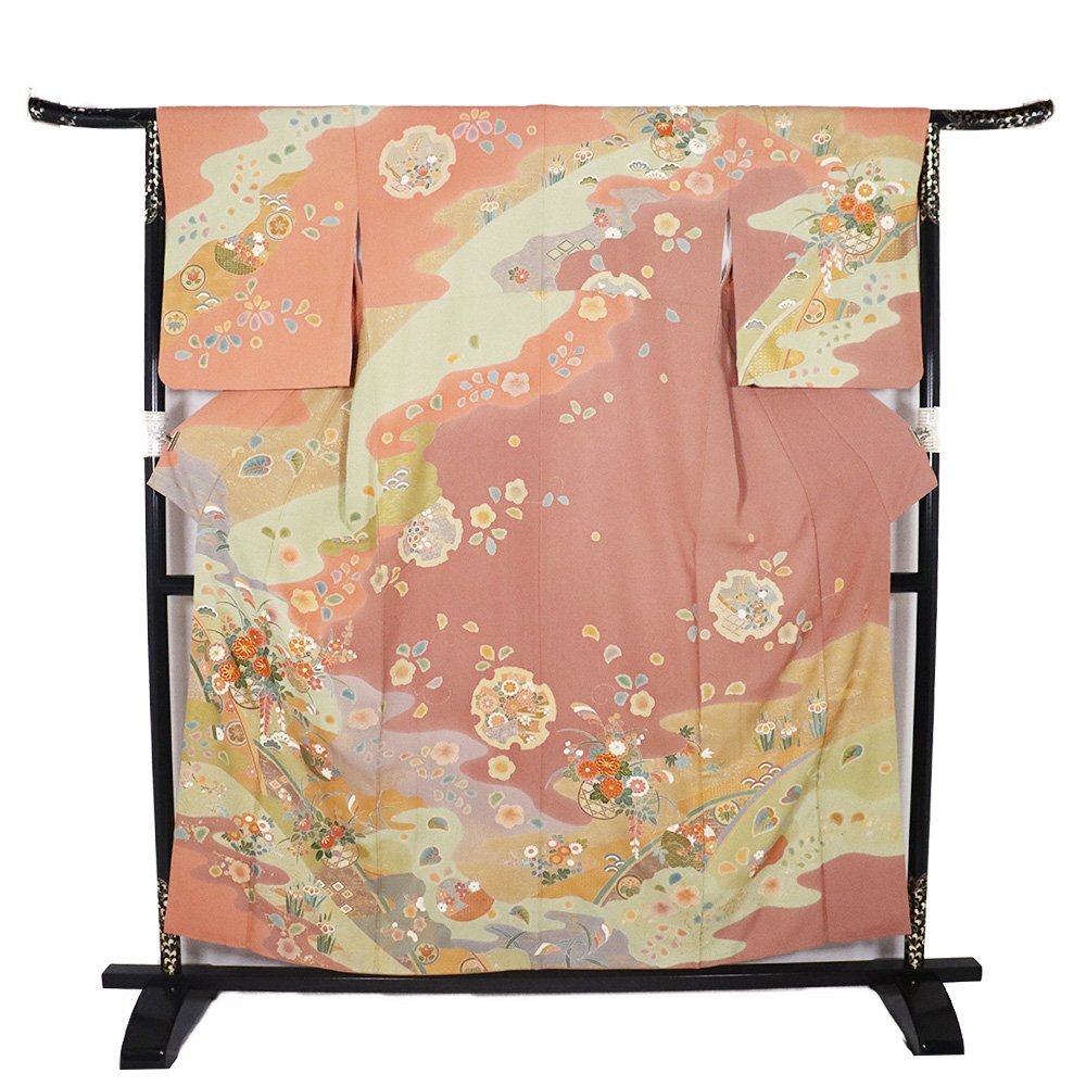 | 商品 | 友禅訪問着 袷 丹後縮緬地 ピンク(薄葡萄色)・赤紫(蘇芳香色)・緑(山葵色)・金箔地 花籠 菊・松竹梅・桜・橘・菖蒲 161 広襟 作家落款入り |