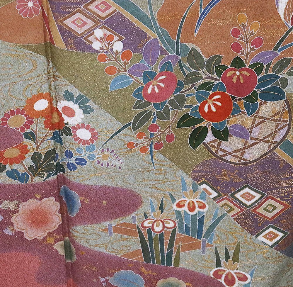 友禅訪問着 袷 丹後縮緬地 ピンク(薄葡萄色)・赤紫(蘇芳香色)・緑(山葵色)・金箔地 花籠 菊・松竹梅・桜・橘・菖蒲 (写真では上手く色が出ない場合があります。ご了承下さい) |