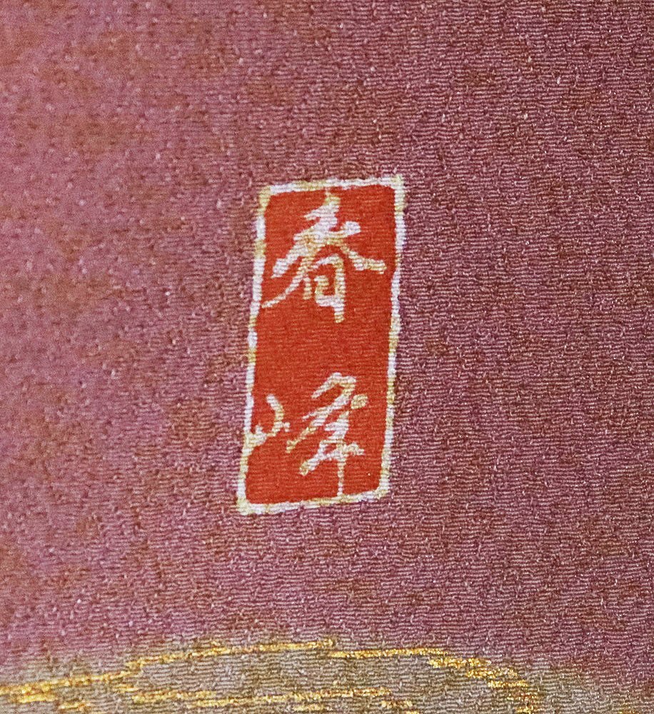 地色は和色大辞典より薄葡萄色・蘇芳香色・山葵色 に近いと思います。 右前身頃衽に作家落款入り。 春峰 この訪問着は地色・柄はもちろんのこと 細かい所にまでこだわっています。 模様も上品で、 照明や太陽の光にあたると、とても豪華にみえます。 とても上品な訪問着です。 生地の状態は良いと思います。 目立ったシミ汚れはないと思います。 美品です。 |