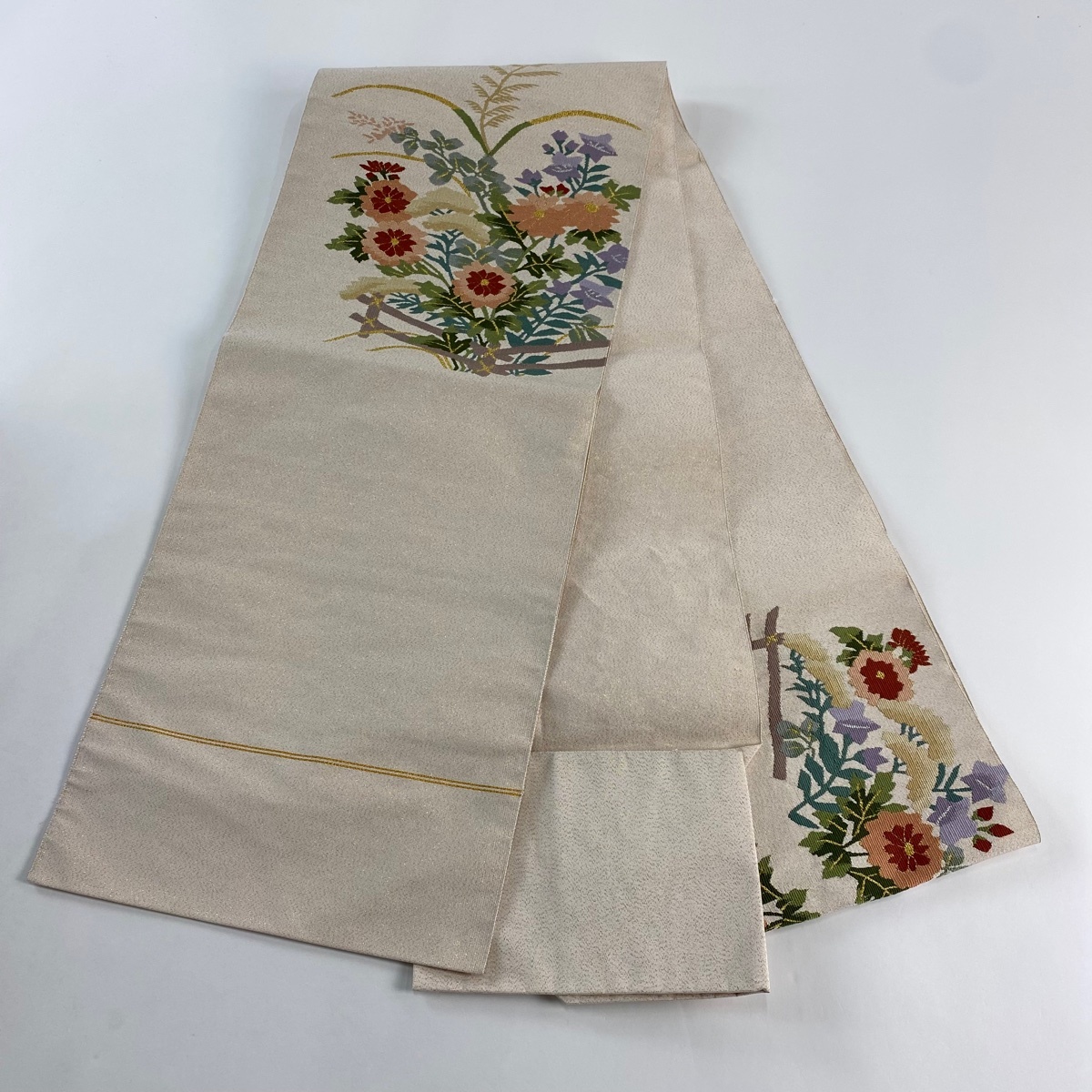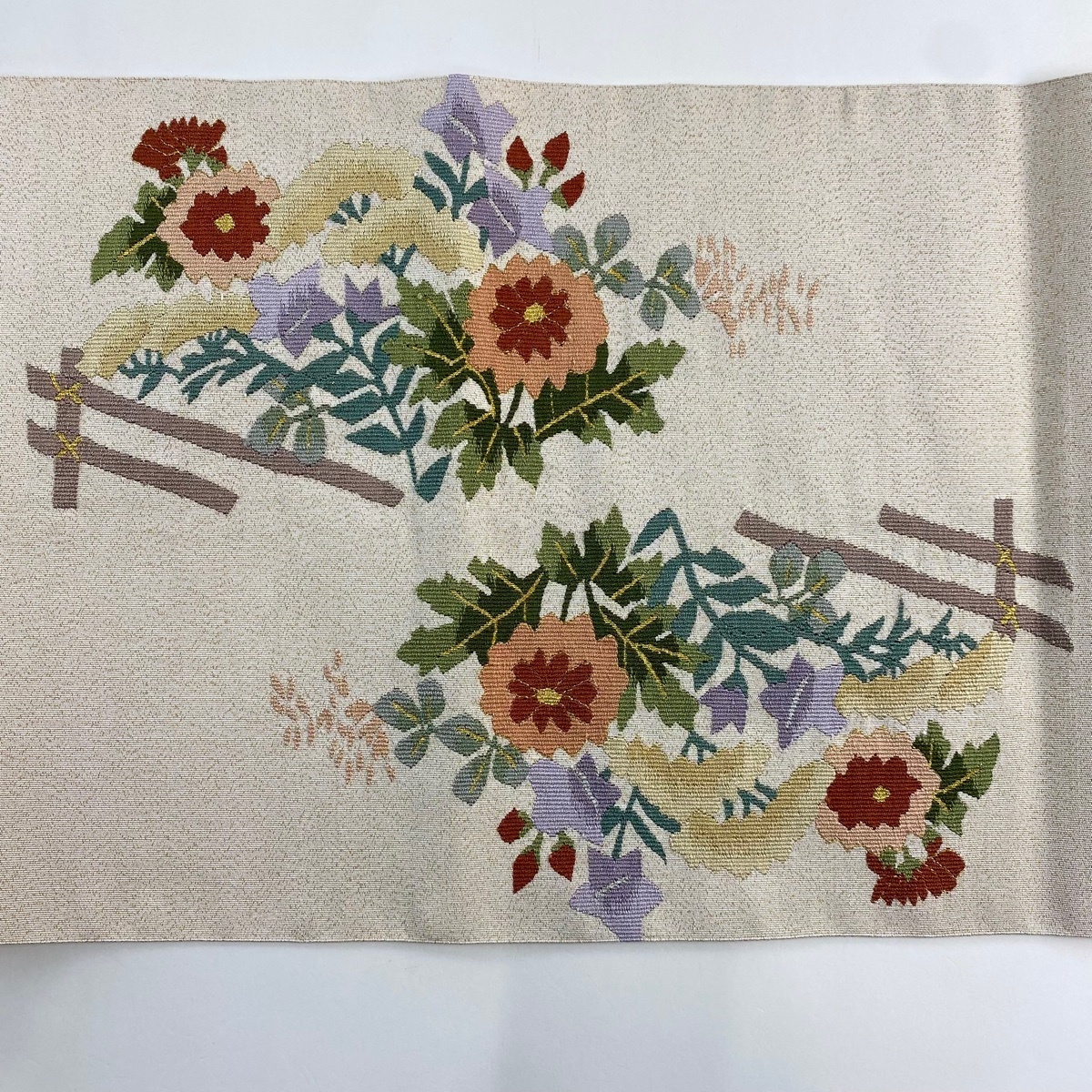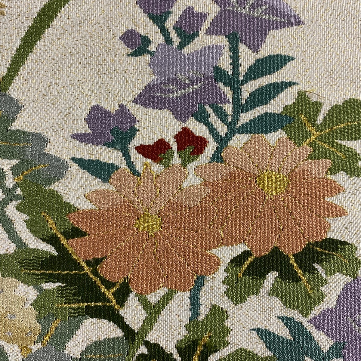 | 名古屋帯 美品 秀品 松葉仕立て トンネル仕立て 八寸名古屋帯 秋草 金銀糸 薄ピンク 正絹 【中古】 |