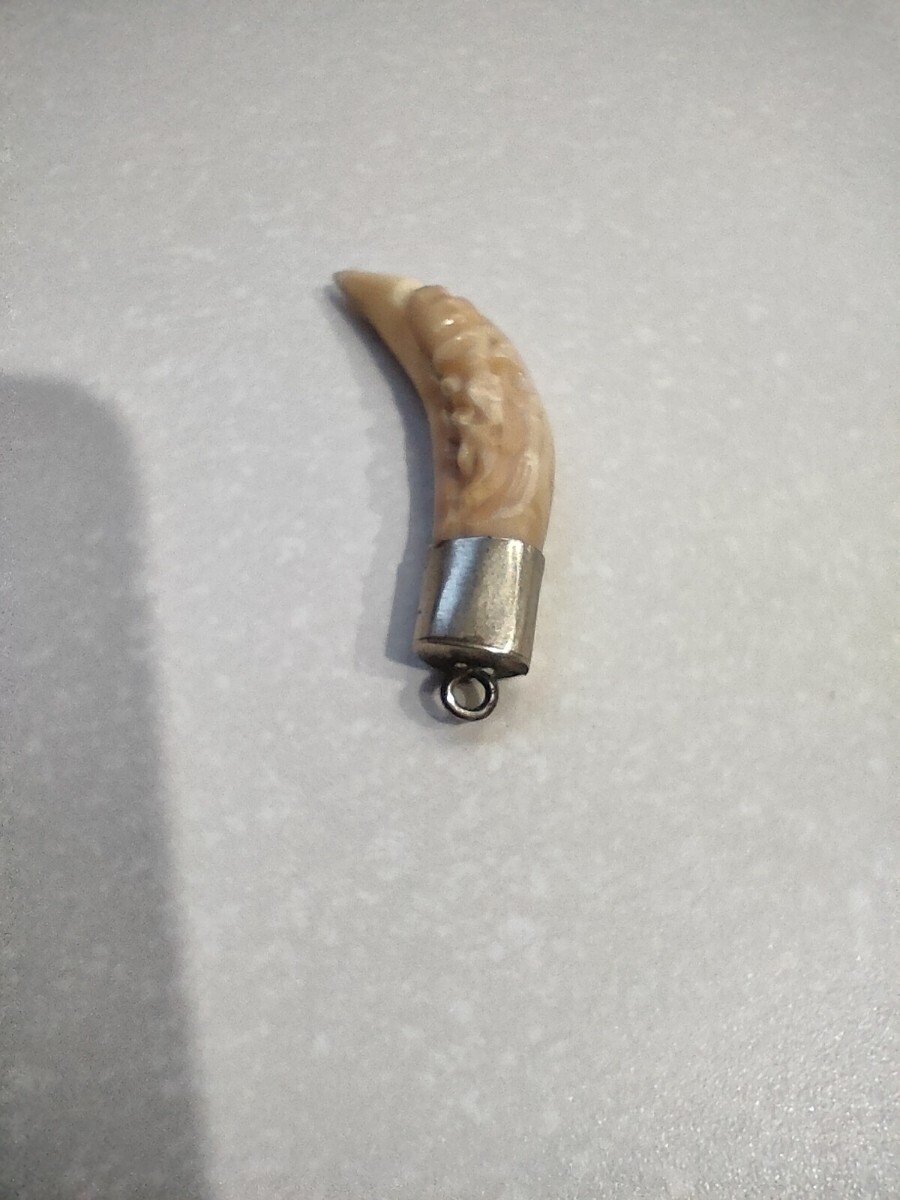 現地の人はオオカミの牙と言っていましたが、そこは不明です。長さ4cm 幅1cm です。重さは約4g です。未使用 です。長期保管していたので 経年劣化はあります。金属部分の材料も不明です。