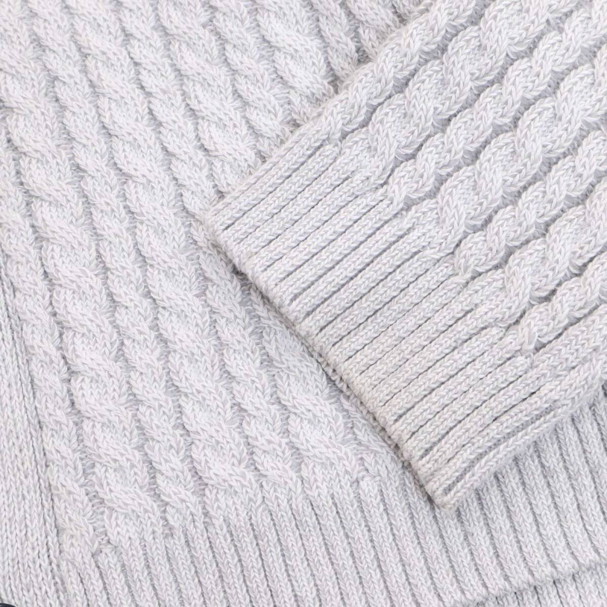 綿タッチポリエステル糸2本とレギュラーポリエステル糸4本を使用し、異なる編地を切り替えたブロックパーツをプレーティングで表現しています。二重編みのしっかりとした張り感と、ボリュームのある立体感が特徴。ポリエステル糸の発色の良さが上質感をプラスしています。