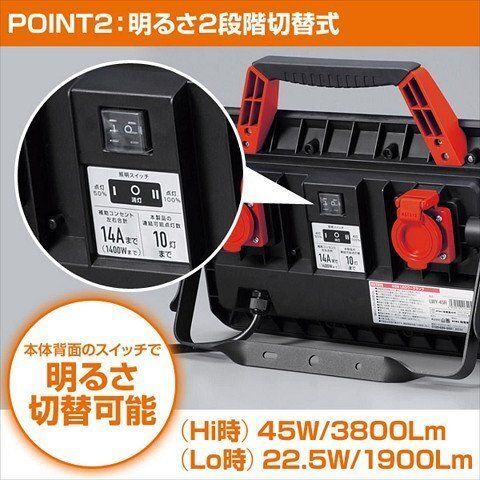 ●明るさ2段階切替式 (Hi時)45W/3800Lm、(Low時)22.5W/1900Lm