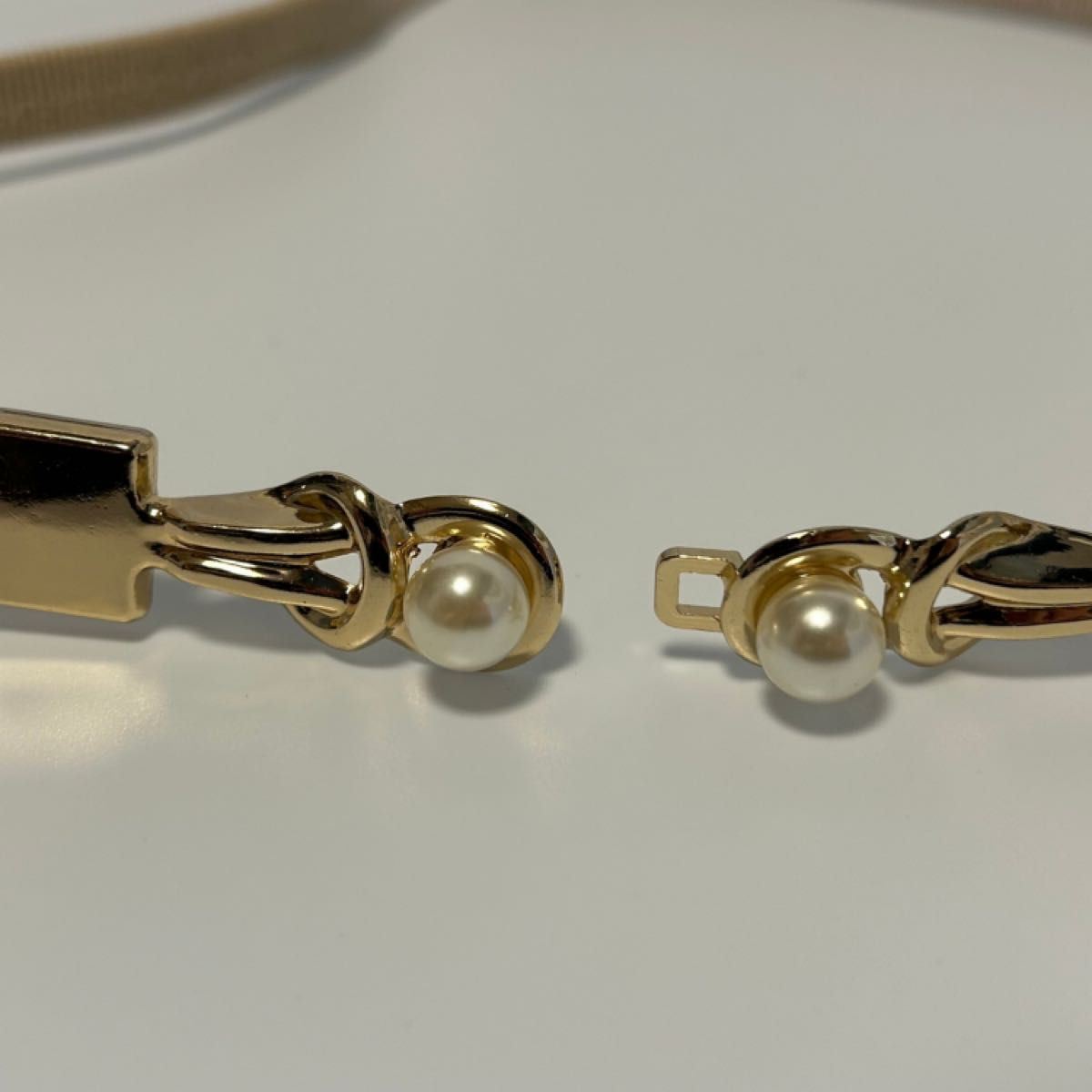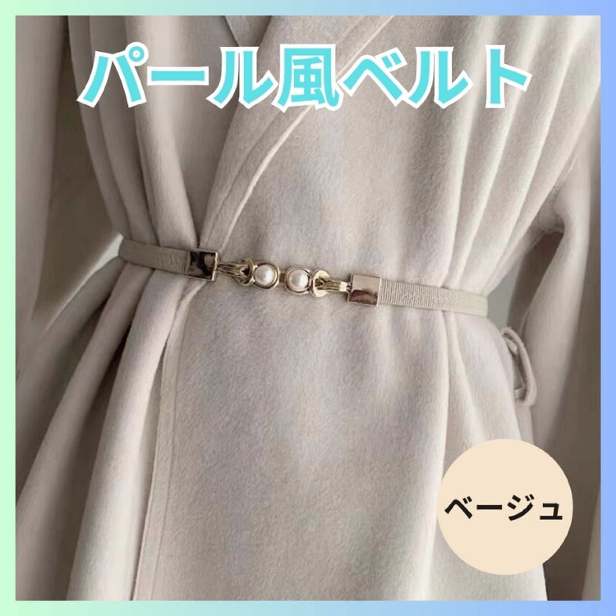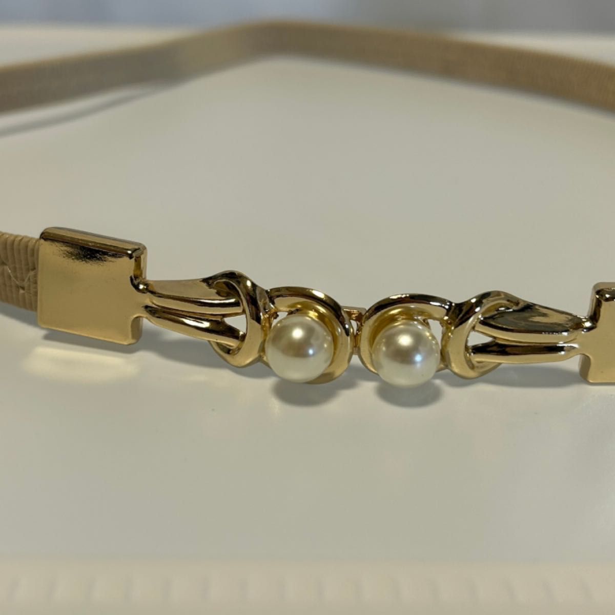 二つのパール風ビーズバックルが連なったデザインが、女性らしさを際立たせるベルトです。