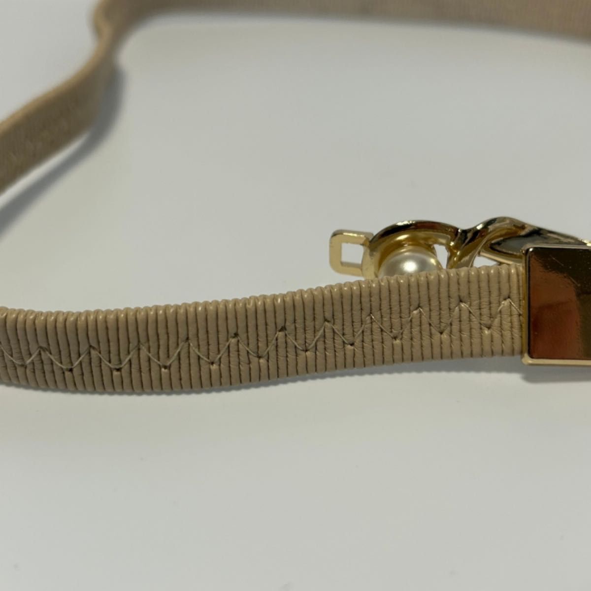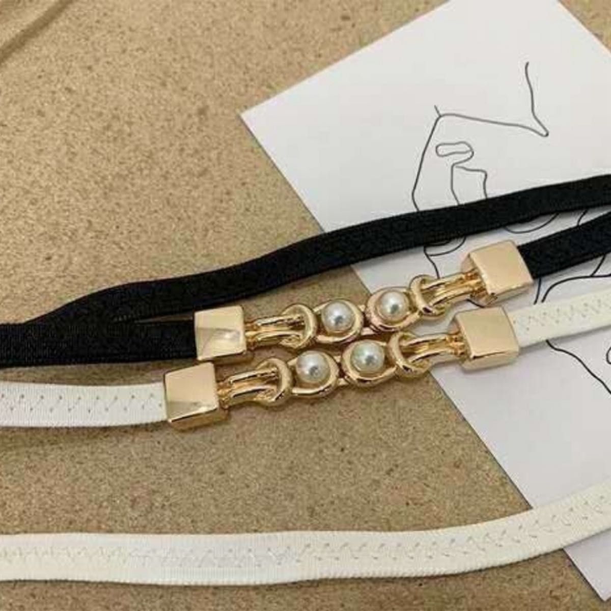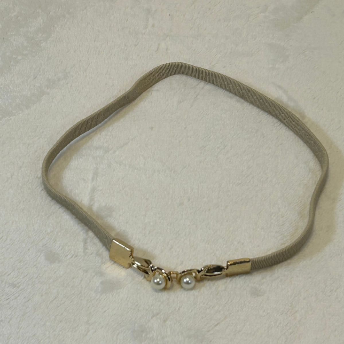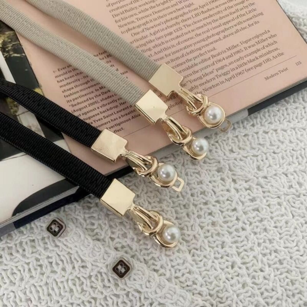 二つのパール風ビーズバックルが連なったデザインが、女性らしさを際立たせるベルトです。