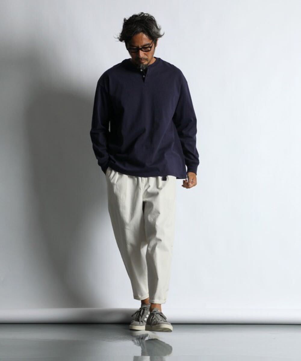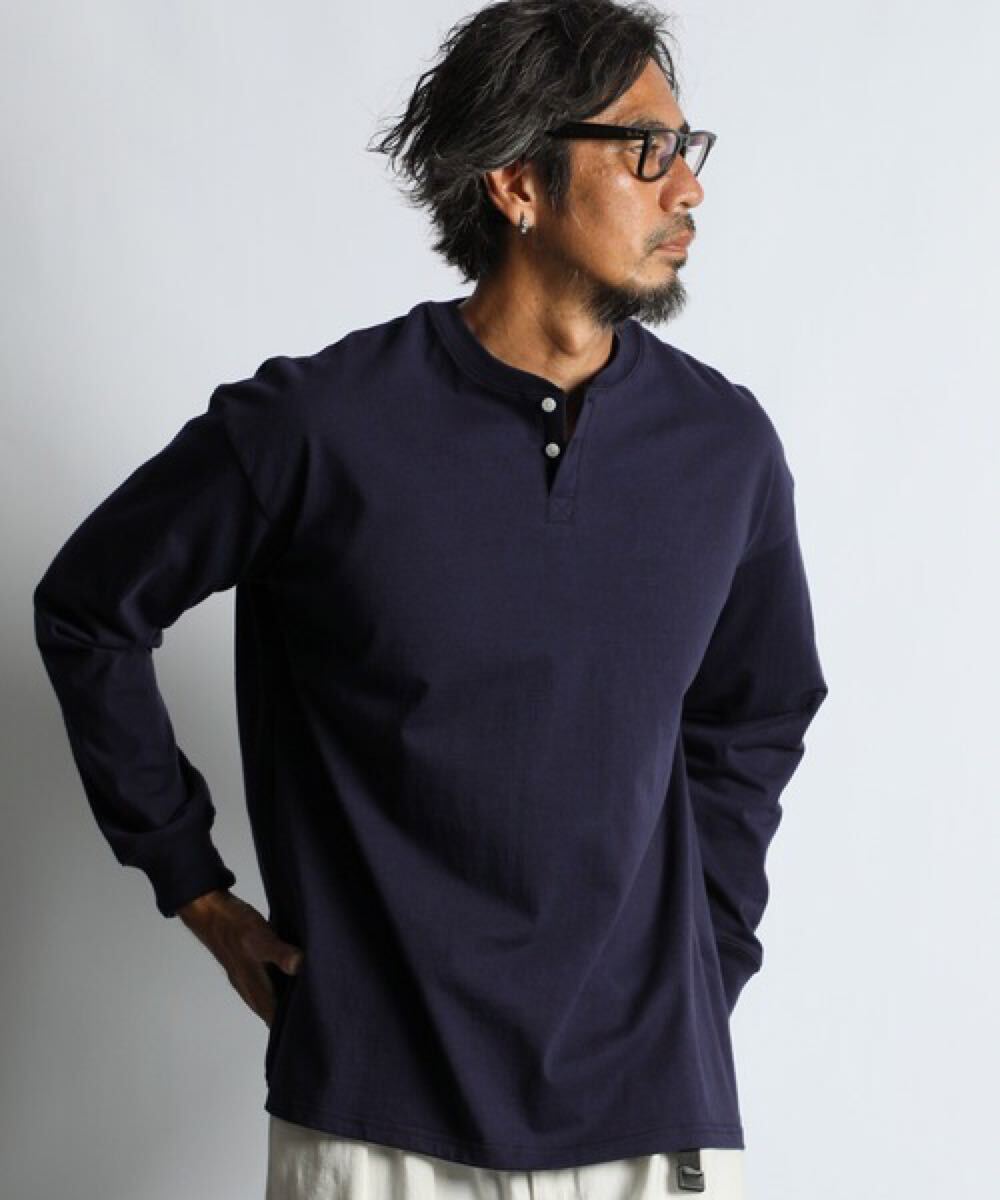 リラックスサイジングで着心地の良さに加え、首元のヘンリーネックデザインがトレンド感をプラスしています。