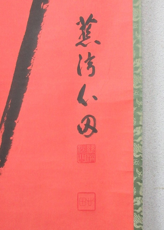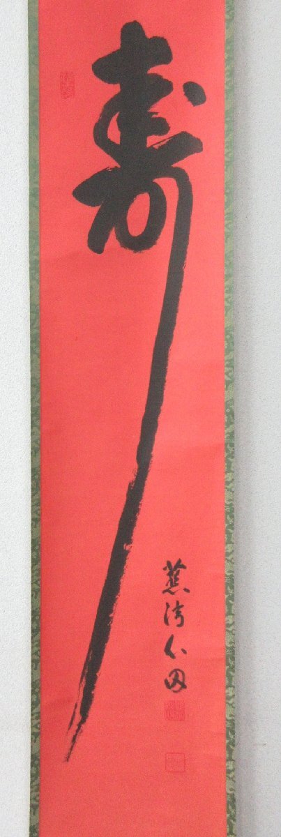 【B0917】掛軸 臨済宗 国泰寺派 管長 国泰僧堂師家 稲葉心田 紅唐紙 一字 『寿』 共箱