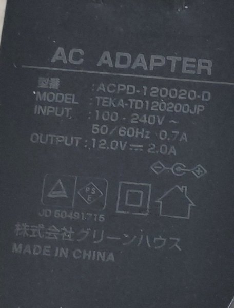 グリーンハウス 純正ACアダプター ACPD-120020-D 12V 2A  動作OK