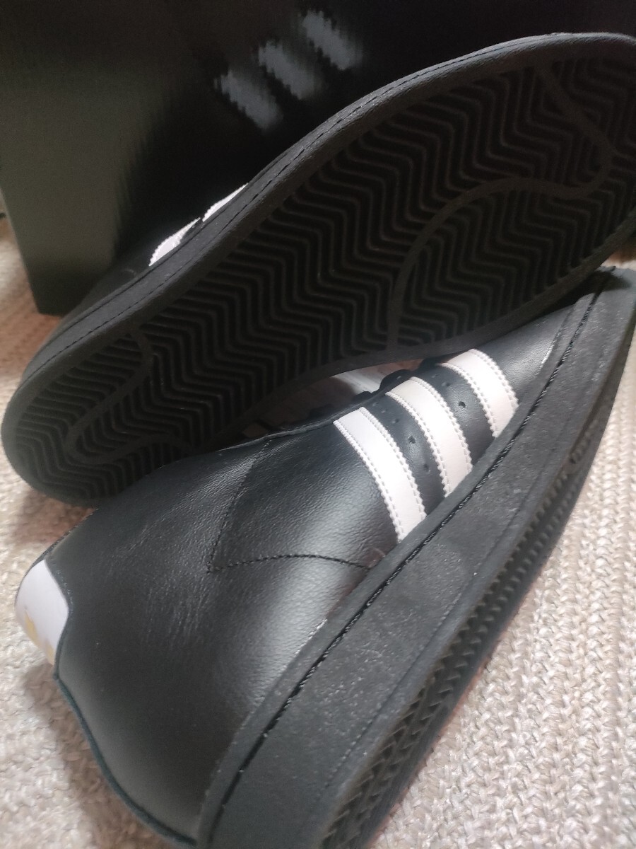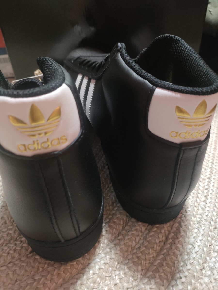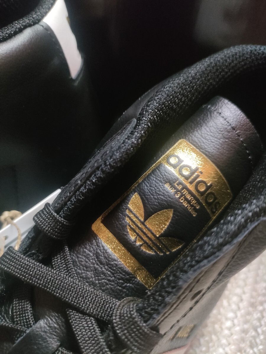アディダスの鉄板カラーブラック×ホワイトにゴールドロゴが魅力です。