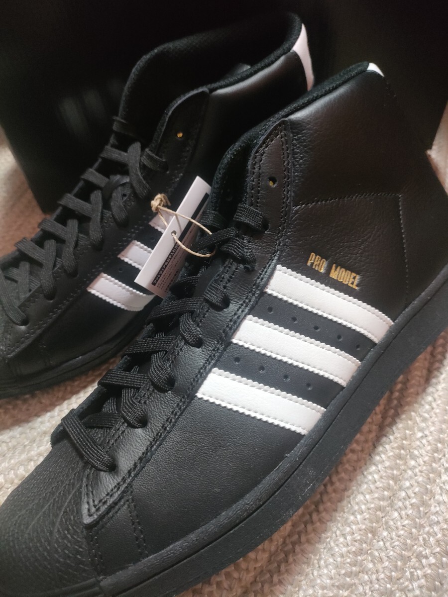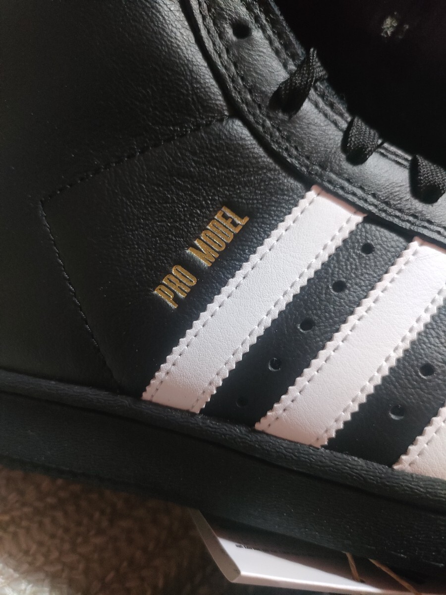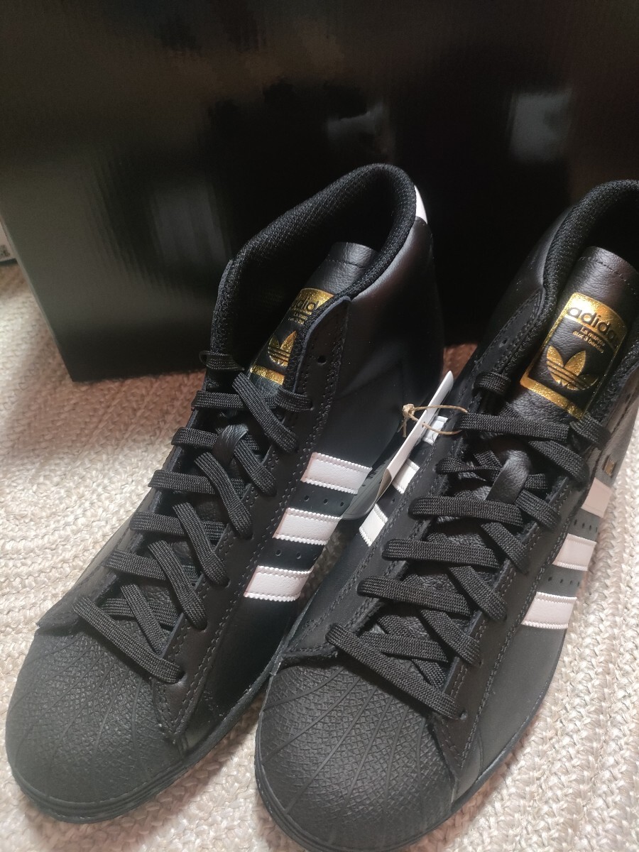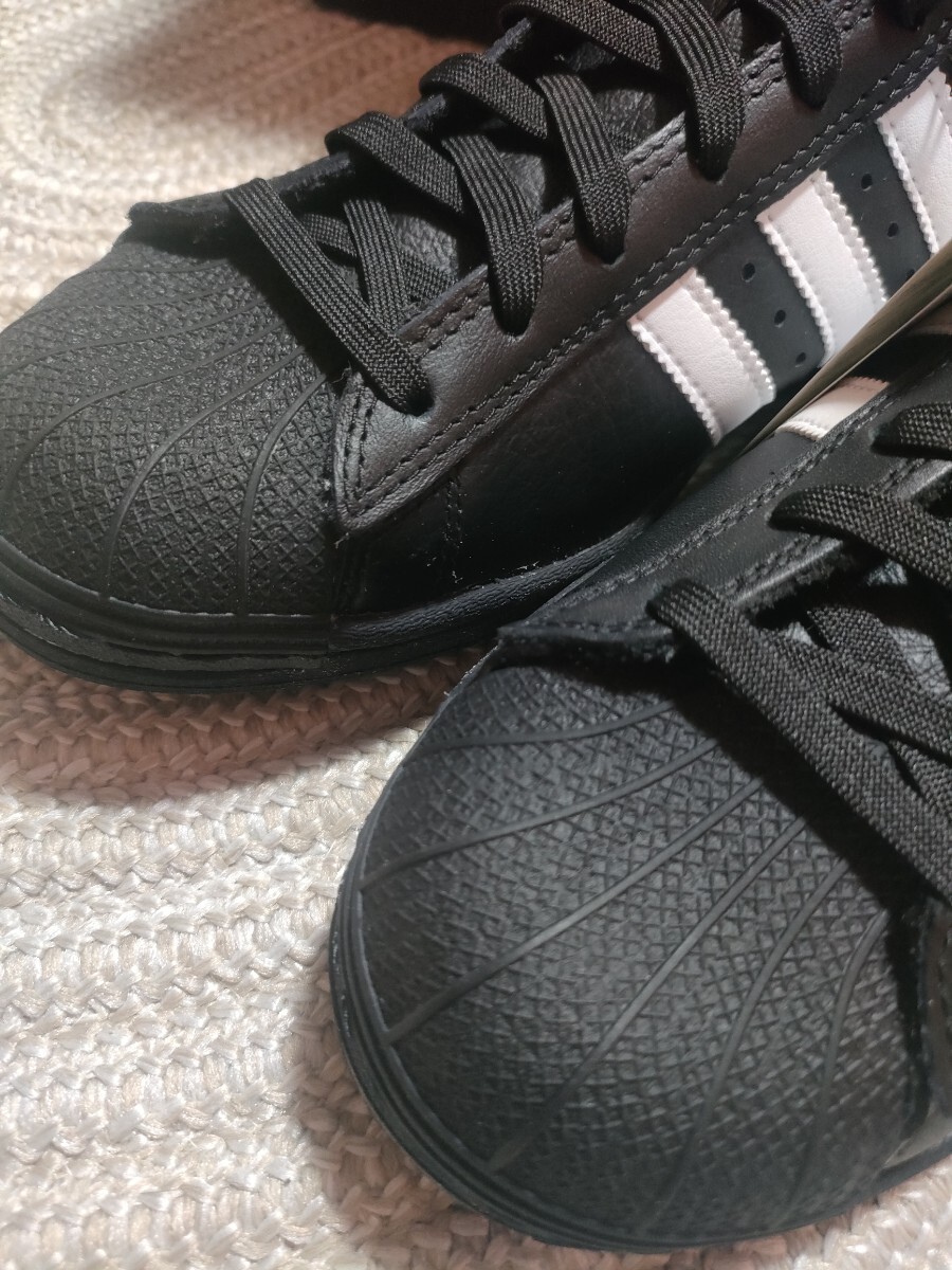 アディダスの鉄板カラーブラック×ホワイトにゴールドロゴが魅力です。