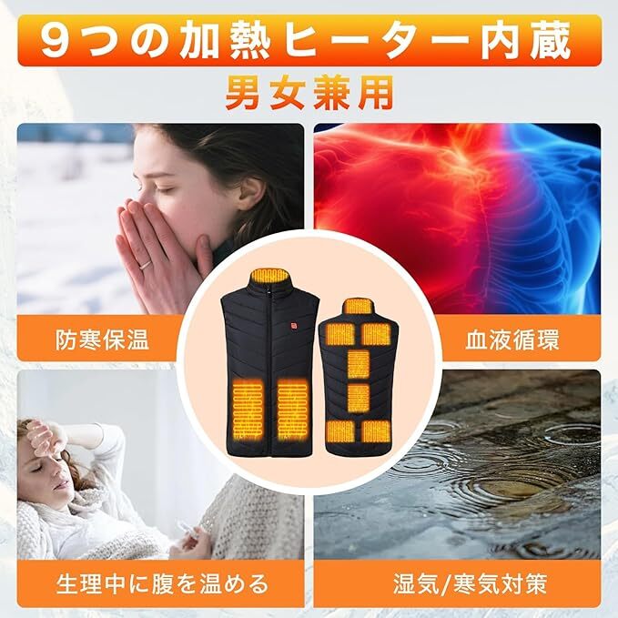 電熱ベスト 温熱ベスト XLサイズ 20000mahバッテリー 日本製ヒーター内蔵 前後9箇所発熱 3段階温度調整 USB給電 洗濯可 節電
