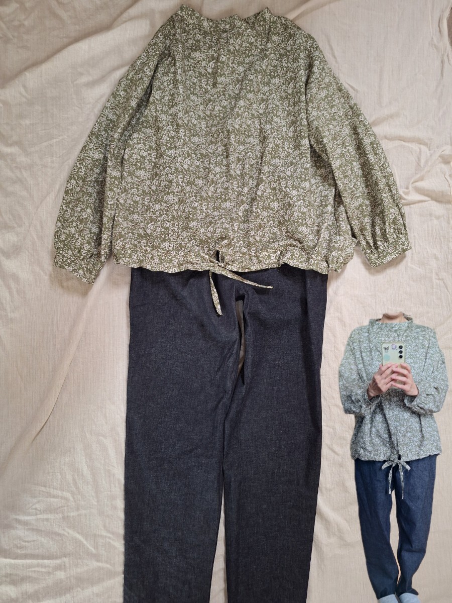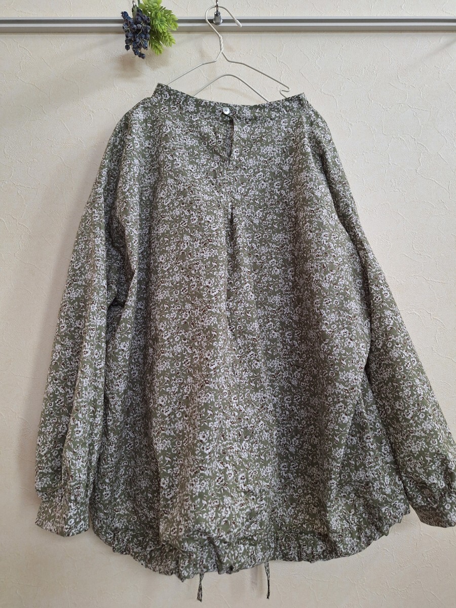 コットン100ローン花柄抹茶生地でボトルネックのプルオーバーブラウスを作りました。
