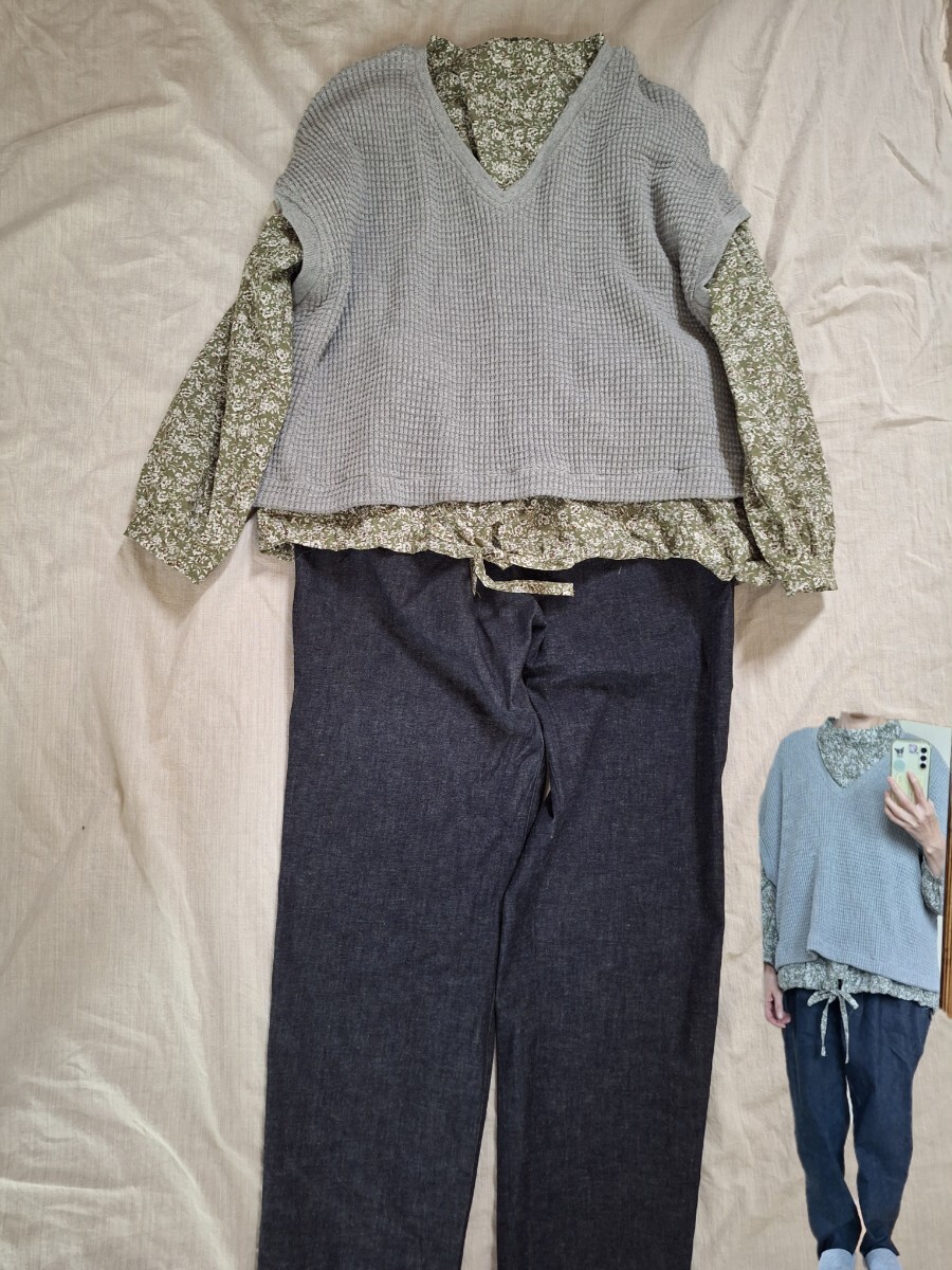 肩落ちでゆったりシルエットですが 裾を絞っていただけるので少しすっきりします。