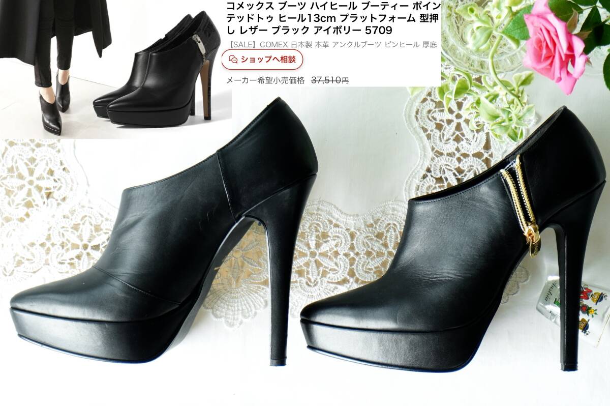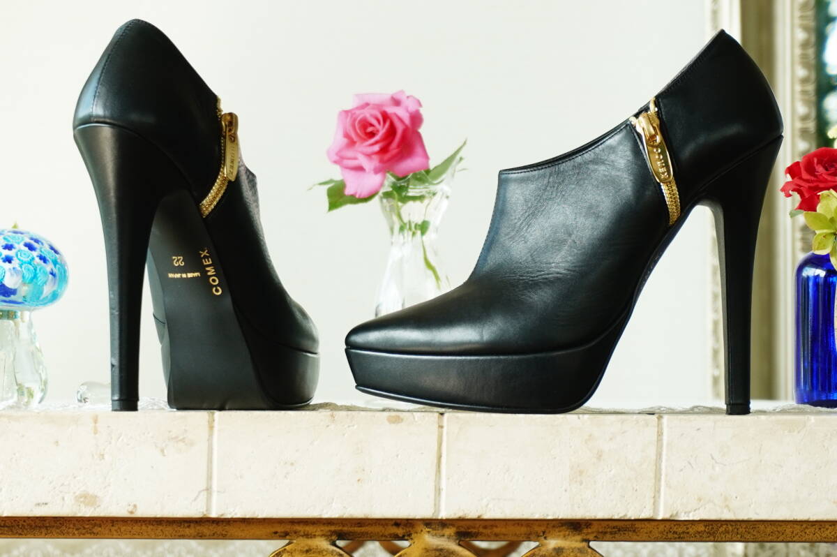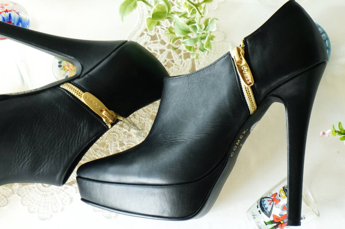 COMEX*37,510円 ブラックスムースレザーブーティー*ハイヒール13厚底ポインテッドパンプストゥショートブーツ黒本革*コメックス22.0~22.5cm