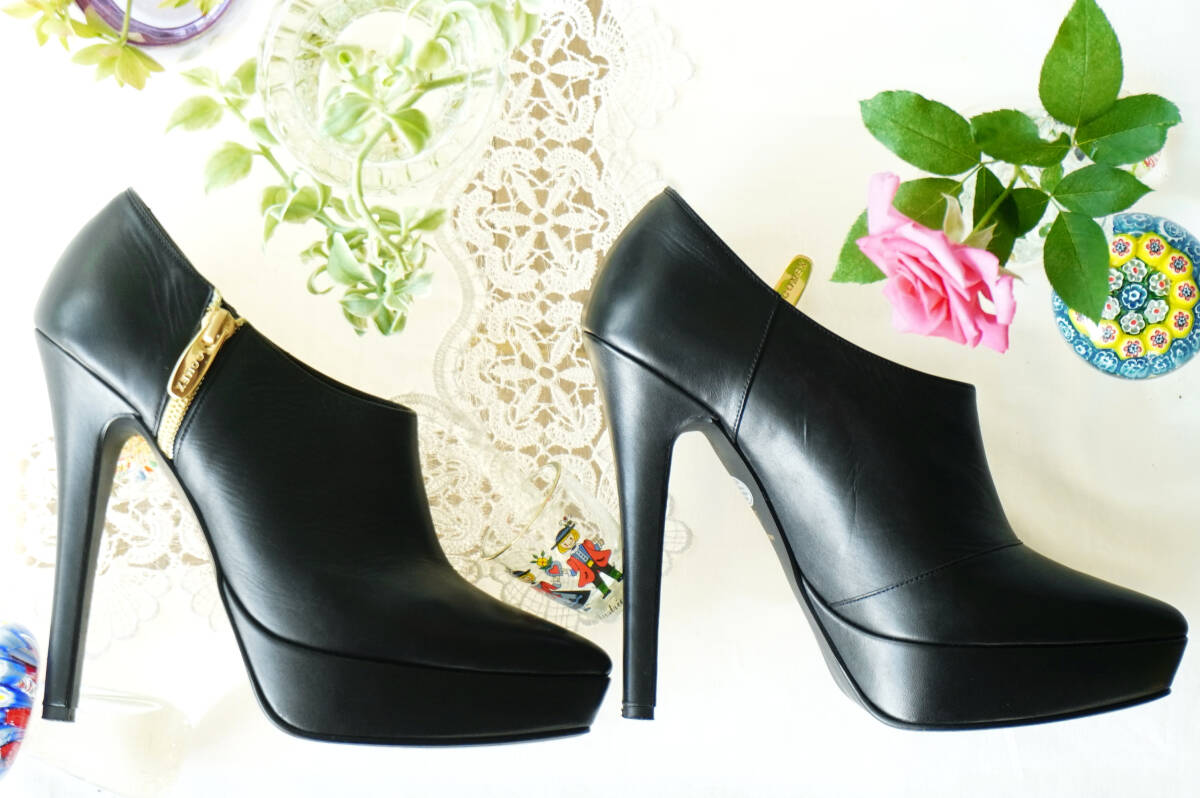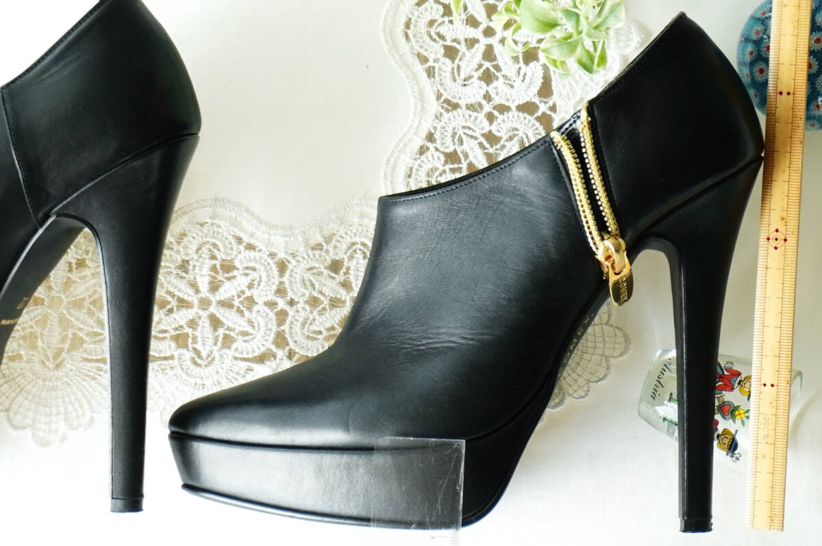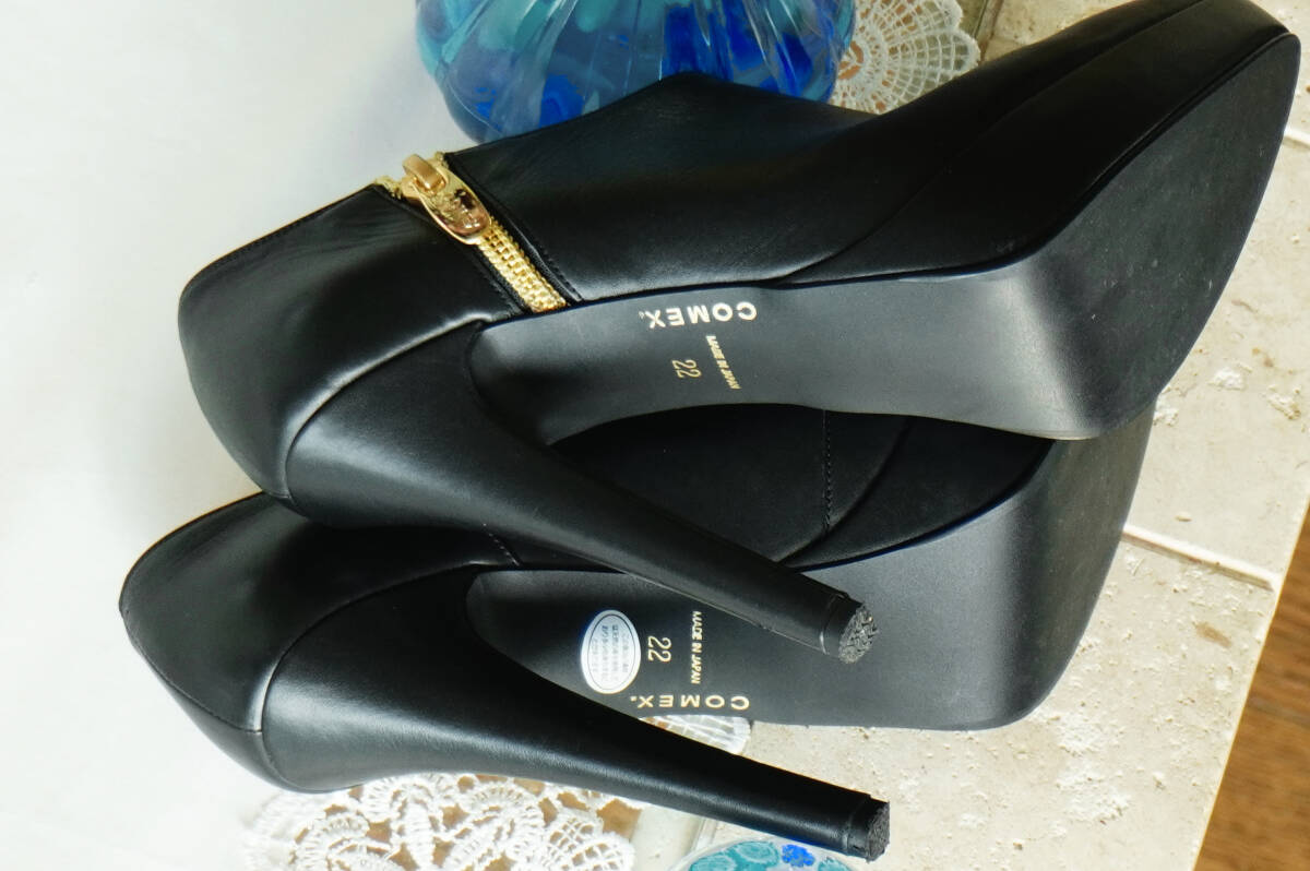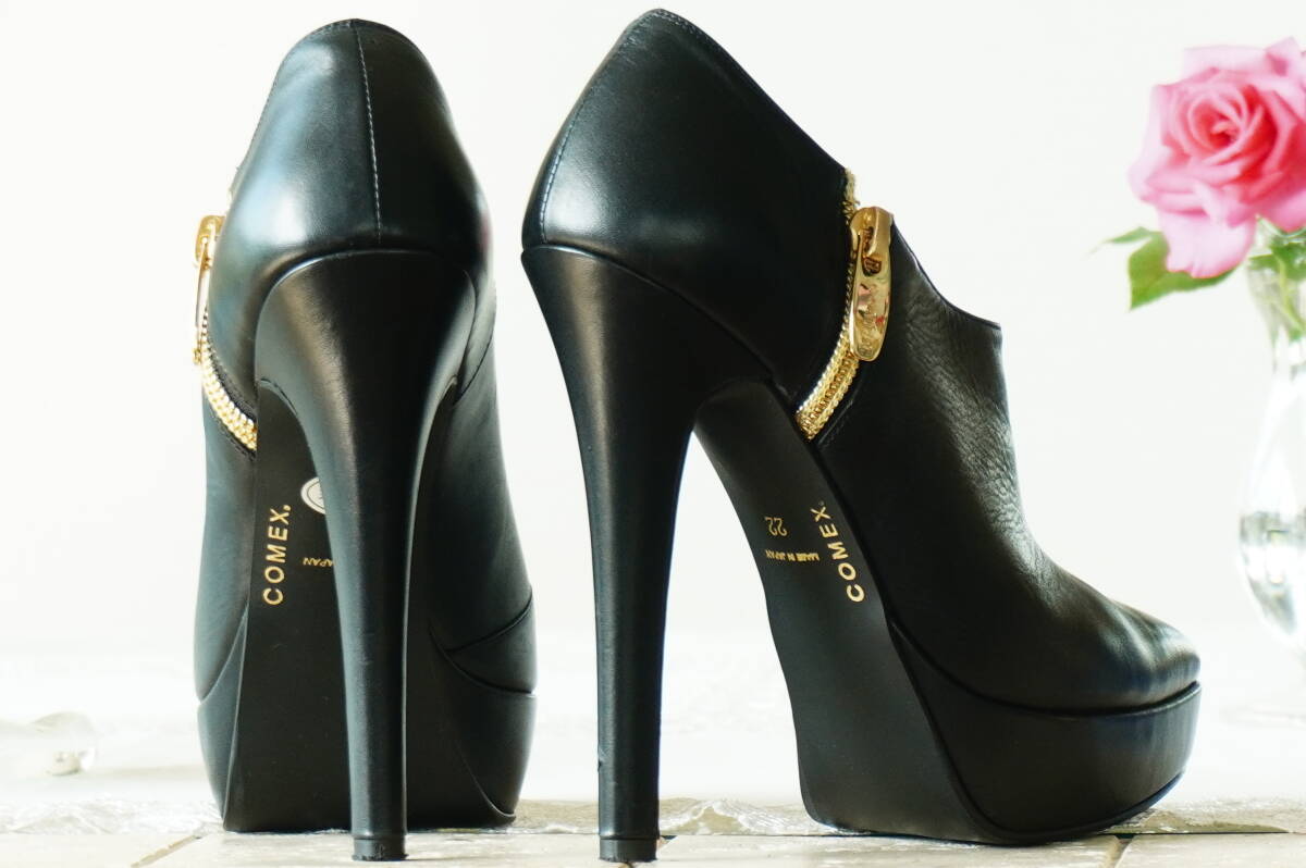 COMEX*37,510円 ブラックスムースレザーブーティー*ハイヒール13厚底ポインテッドパンプストゥショートブーツ黒本革*コメックス22.0~22.5cm