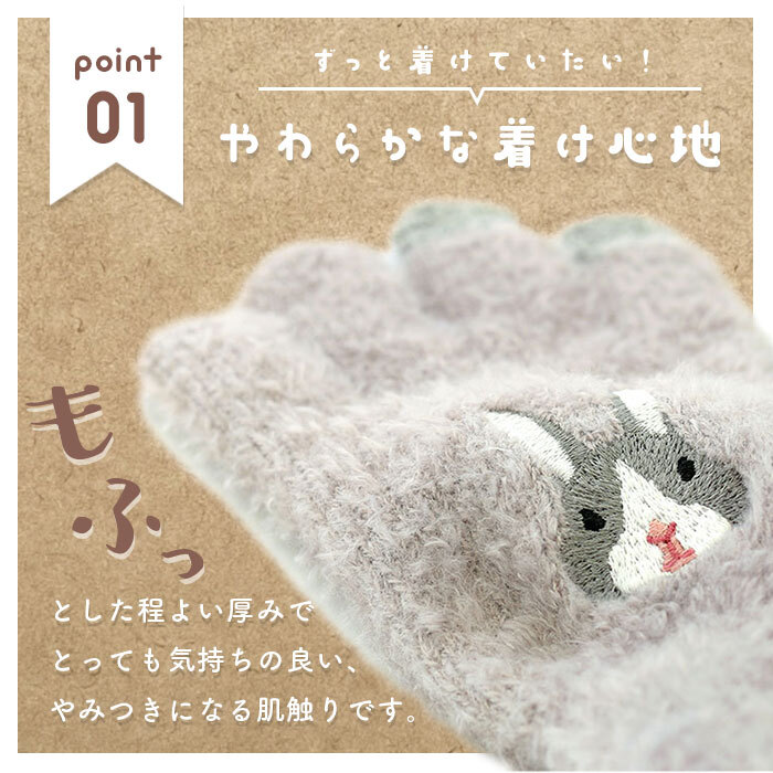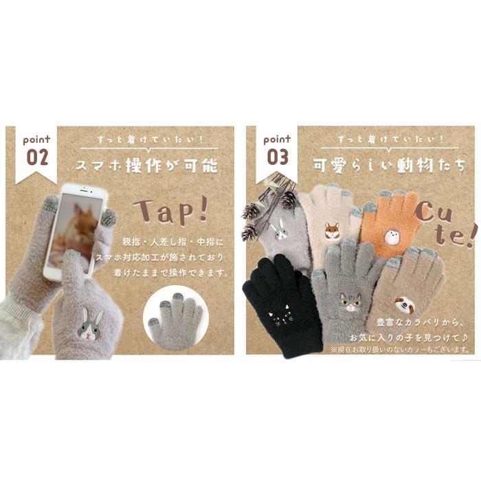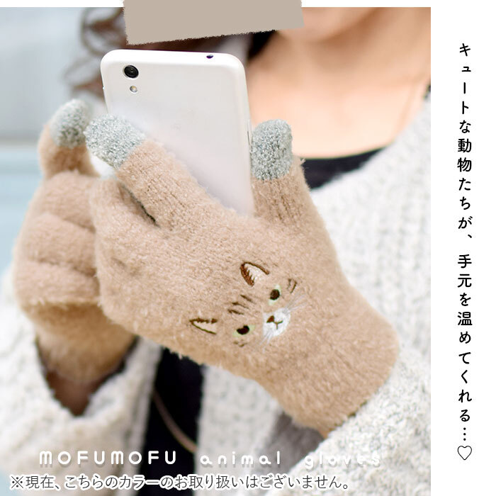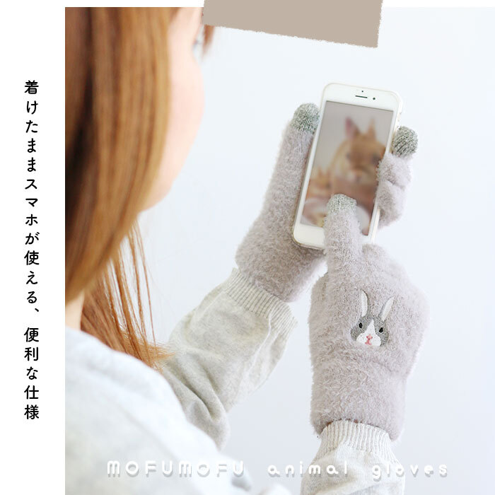 | 商品説明 | ・・動物の刺繍がかわいい!もふもふスマホ手袋。 ・親指、人差し指、中指にスマホ対応加工が施されていて、着けたまま、スマホなどのタッチパネルの操作が可能。 ・寒い冬、通勤や通学時など色々なシーンで手袋を外さずにつかえるのが嬉しい♪ ・もふもふっとした、とっても気持ち良い肌触り。 ・ほどよいフィット感で脱げにくいのもうれしいポイント。 ・親子で素敵にリンクコーデもできちゃう!キッズサイズとお揃いで使うのもおすすめ♪(※本商品ページでは、レディースフリーサイズのみの販売となります。スマホ手袋キッズサイズ[商品コード:smartgloveskids]は別商品ページにてお買い求めいただけます。) |