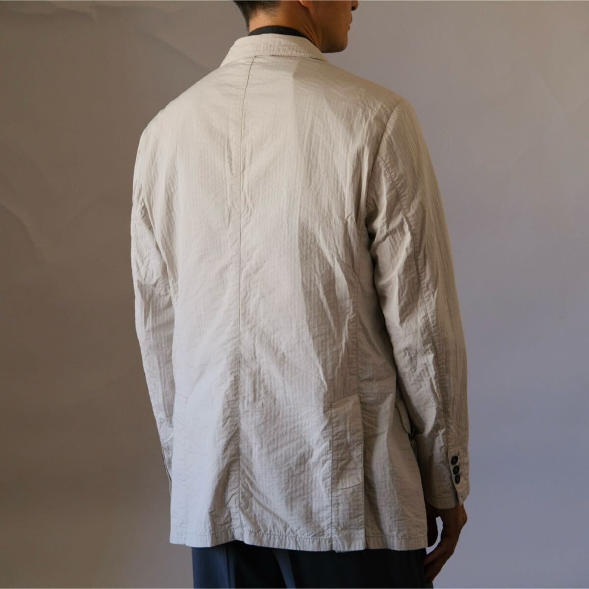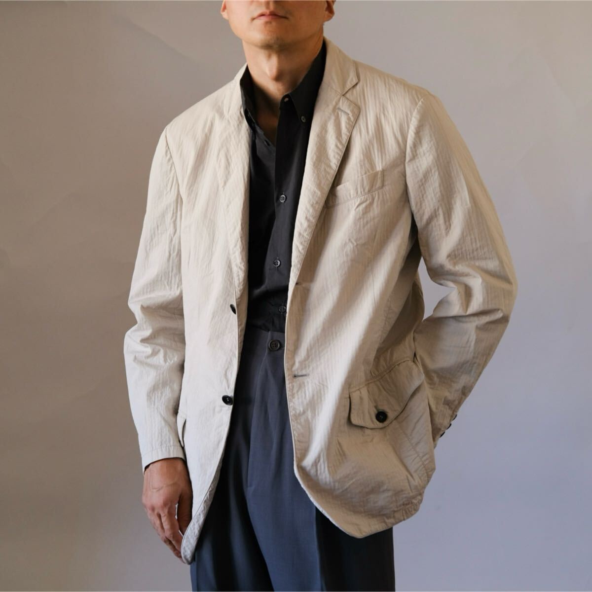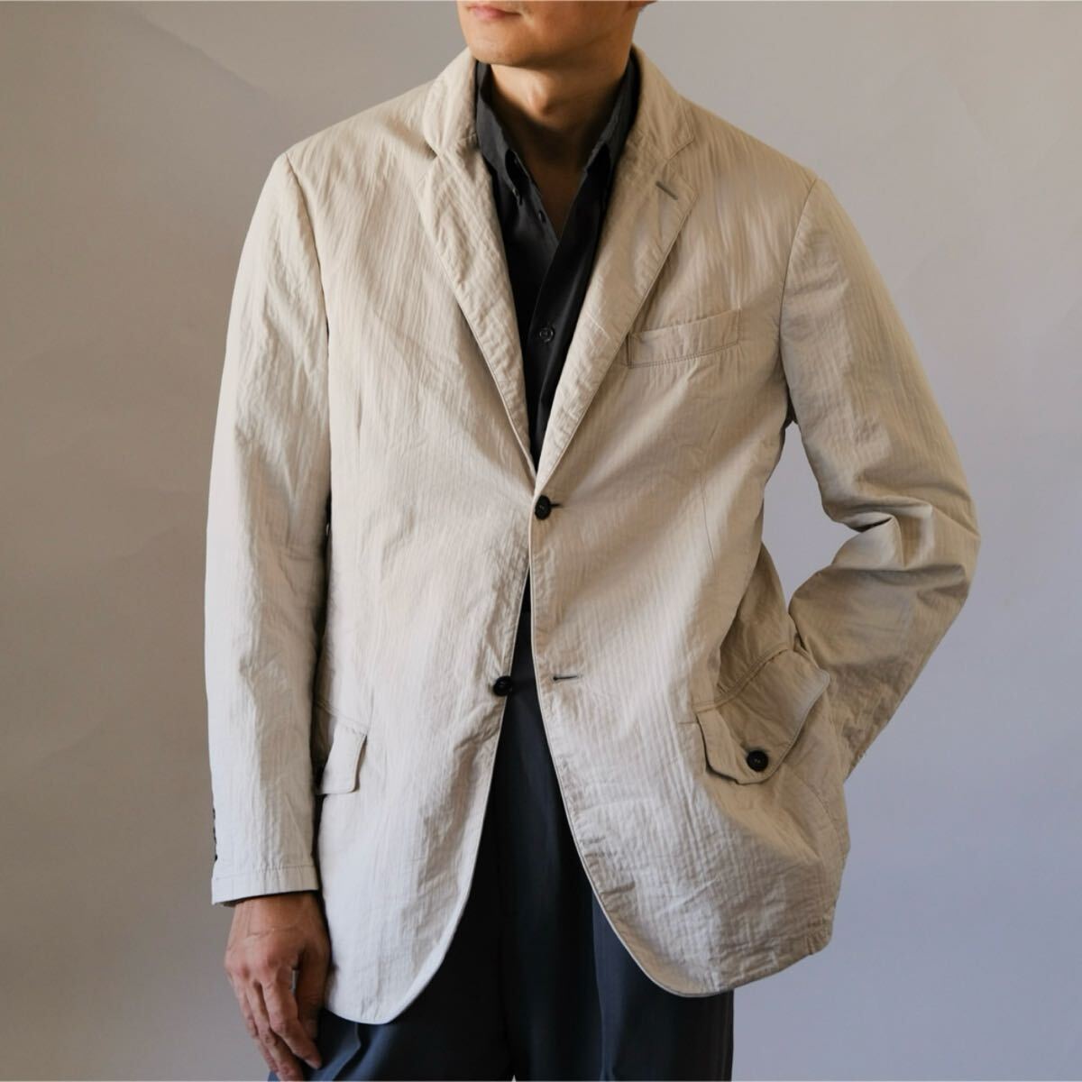 バルキーなハリ感ある生地をウォッシュした掛け合わせ質感でバサっと羽織る色気あるセンスはアルマーニならでは。