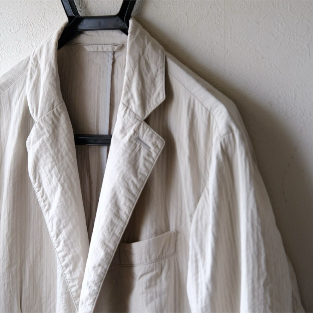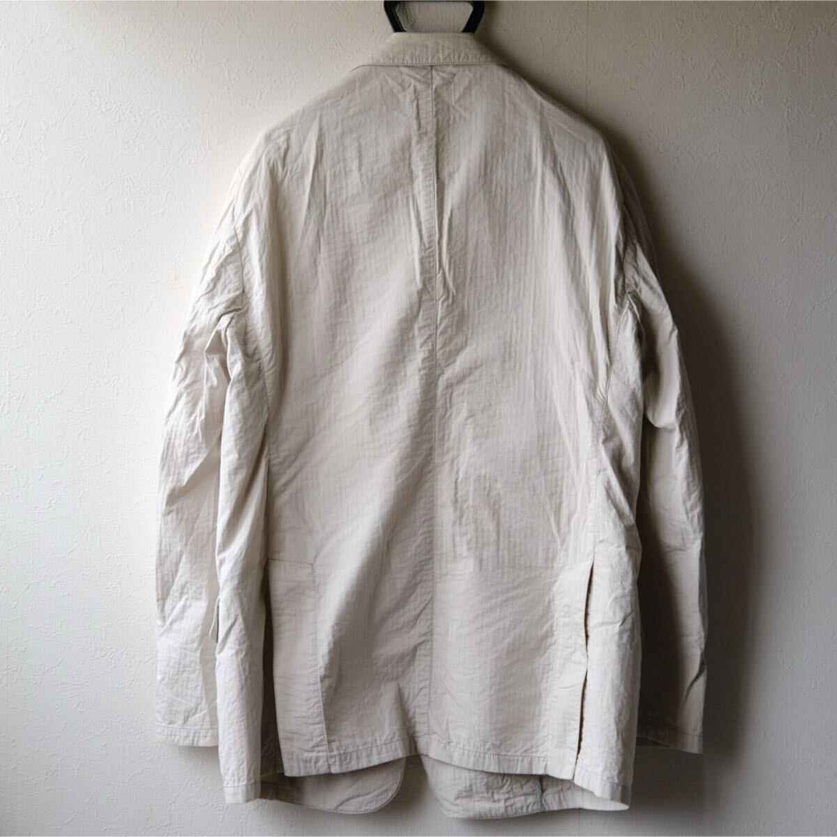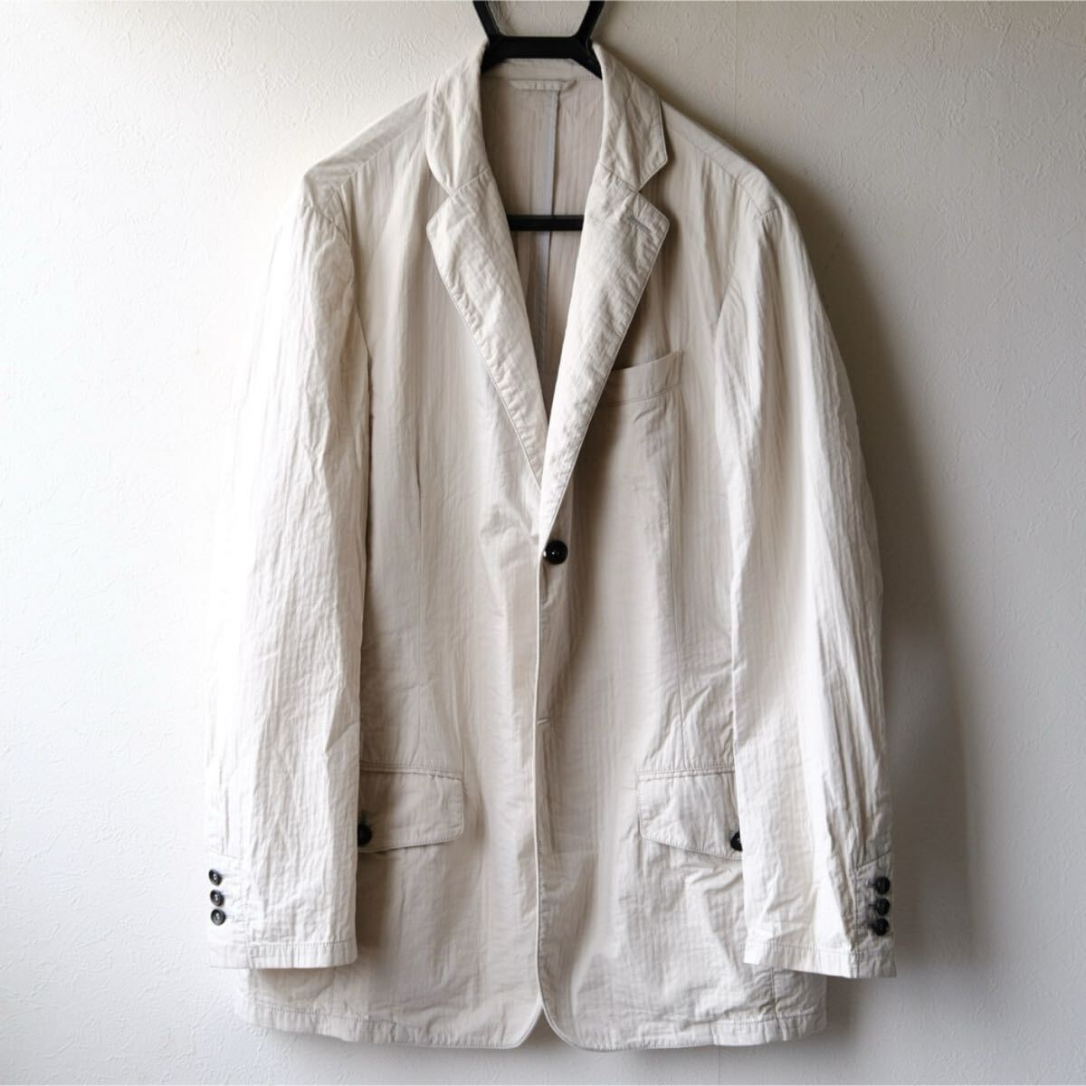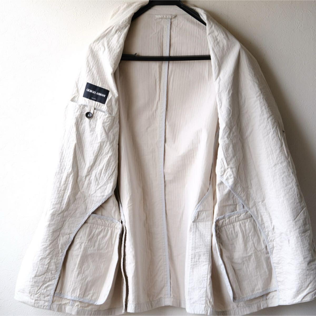 バルキーなハリ感ある生地をウォッシュした掛け合わせ質感でバサっと羽織る色気あるセンスはアルマーニならでは。