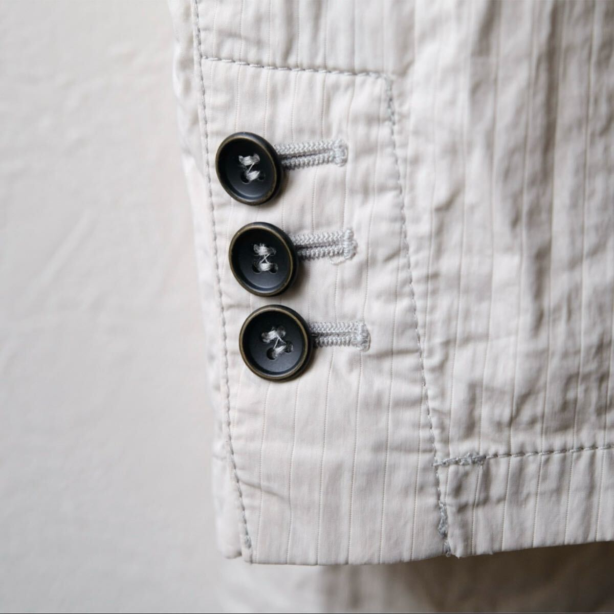 フロント2ボタン、袖本切羽3ボタン、サイドベンツ