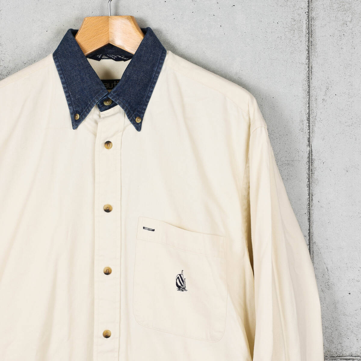 【ブランド】 NAUTICA / ノーティカ 【アイテム】 ツイル素材 ボタンダウンシャツ 【商品説明】 アメリカで購入しました、ノーティカの襟部分だけがデニムになったツイル素材のボタンダウンシャツになります。 【カラー】 オフホワイト×デニム 【コンディション】 使用に伴う色落ちや擦れなどがあります。 【サイズ】 サイズ:M 身幅:61cm 肩幅:53cm 着丈:82cm 袖丈:64cm | |||