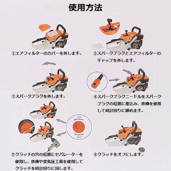 | 商品詳細 | 「チェーンソーの交換メンテナンスに」経年劣化やサビつき、故障などで動きが悪くなったチェーンソーの交換にお使いいただけるクランクシャフトとピストンストッパーツールになります。 Baumr-ag SX38 38cc SX45 45cc SX62 62cc および SX66 66cc チェーンソーに適合。 「簡単な操作で取り外し」使い方はスパークプラグを取り外し、このツールを所定の位置にネジで固定するだけで簡単に着脱ができます。 ピストン上部への損傷を防ぐために、端は丸みを帯びたデザインになっております。 使用方法: 1.のこぎりからスプロケットカバーを取り外します。 2.次に、スパークプラグを取り外し、ピストンストッププラグをその場所に取り付けます。 3.次に、ピストンがピストンストップに触れるようにクラッチを回転させてエンジンを回転させます。 4。次に、クラッチの上部に取り外しツールを配置して、クラッチの対応する穴のクラッチデマウントツールスロットの3つのプロングと取り外しツールの下部がきれいに均等に平らにフィットするようにしますをクリックします。 5.最後にレンチとソケットまたはスパナを使用し、ツールとクラッチを反時計回りに回転させてクラッチを取り外します。 ■商品仕様 ・ピストンストップx1pc、クラッチ取り外しツールx1pc |