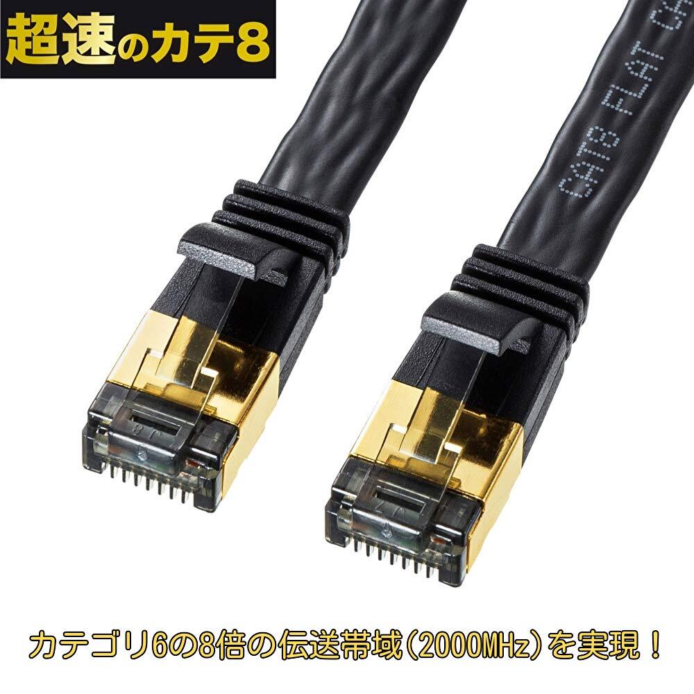 サンワサプライ CAT8フラットLANケーブル(2m) 40Gbps/2000MHz RJ45 ツメ折れ防止 ブラック KB-T8FL-02BK