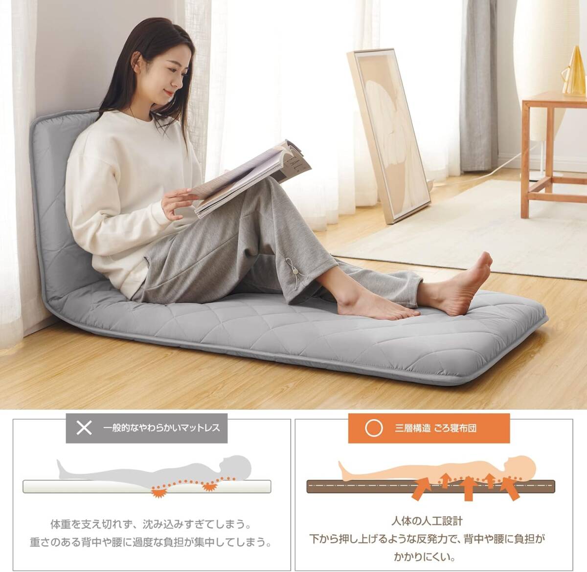 【限られた空間を快適に】わざわざ夜の重たい布団を出さなくても、気軽に昼寝やうたた寝ができます。68x120cmの大きさで、寝転がるのに充分!自分用だけではなく、来客用の敷布団にも使えます。また、3分の1のところで折りたたんで、壁などに寄せて即席のソファができちゃいます。背面は二層重ねてふっかり気持ちいい。テレビ、スマホを見る時間や、読書、ゲームの時間をより快適にできます。座布団として使えば2人以上が座れるので来客時にもおすすめです。様々な使用シーン テントの中でや、ピクニックなどの屋外使用。 車中泊での使用。