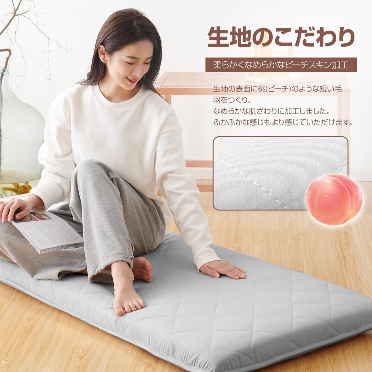 【さらっとした肌触り・三層構造】長く使える三層構造で、高弾力のある「硬質綿」を使用しています。お昼寝布団 はピーチスキン加工とは軽い起毛を施した桃の皮のような風合いに仕上げる特別な加工です、肌触りの心地よさを実感していただけます。【素材】側地:ポリエステル100%(ピーチスキン加工) 中層:固綿 ポリエステル100%