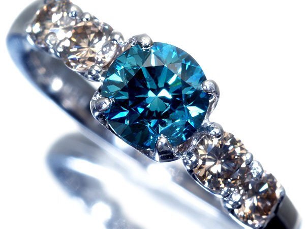 美しい輝き放つ超希少な超大粒極上1粒天然ブルーダイヤモンド1.007ct&脇石上質ライトブラウンダイヤモンド総計0.50ctを素敵に宝飾した、超高級K18WGリングを1円から特別大放出致します!