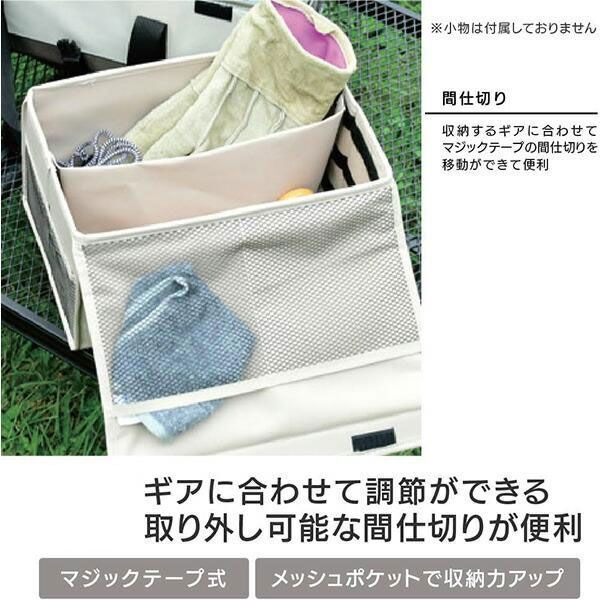 内 容 | ■キャンパーズコレクション コンテナバッグ ■品番 CCB-M(BE/KH) ■本体サイズ M(約幅31×奥行19.5×高さ17cm) ■カラー ベージュ/カーキ ■材質:本体/ポリエステル ●アウトドア用品の整理整頓・持ち運びに便利なスクエア型収納バッグ。 ●側面にはメッシュポケット付き。 ●収納物に合わせて仕切り板を調整できます。 ●バックル付きの蓋で中身がこぼれにくいです。 |