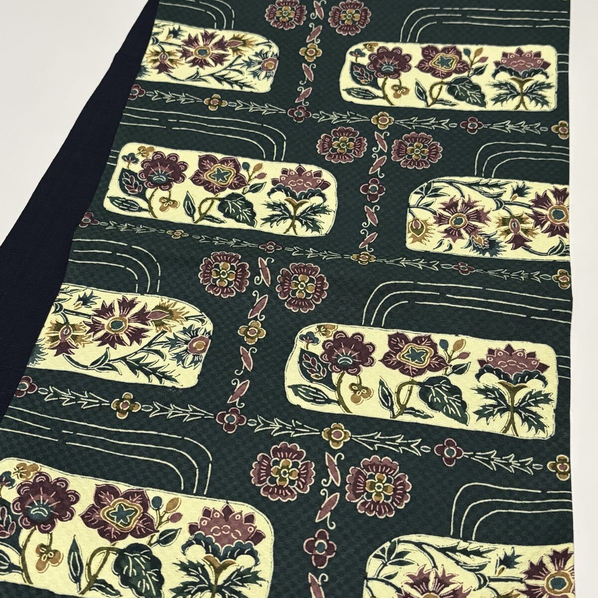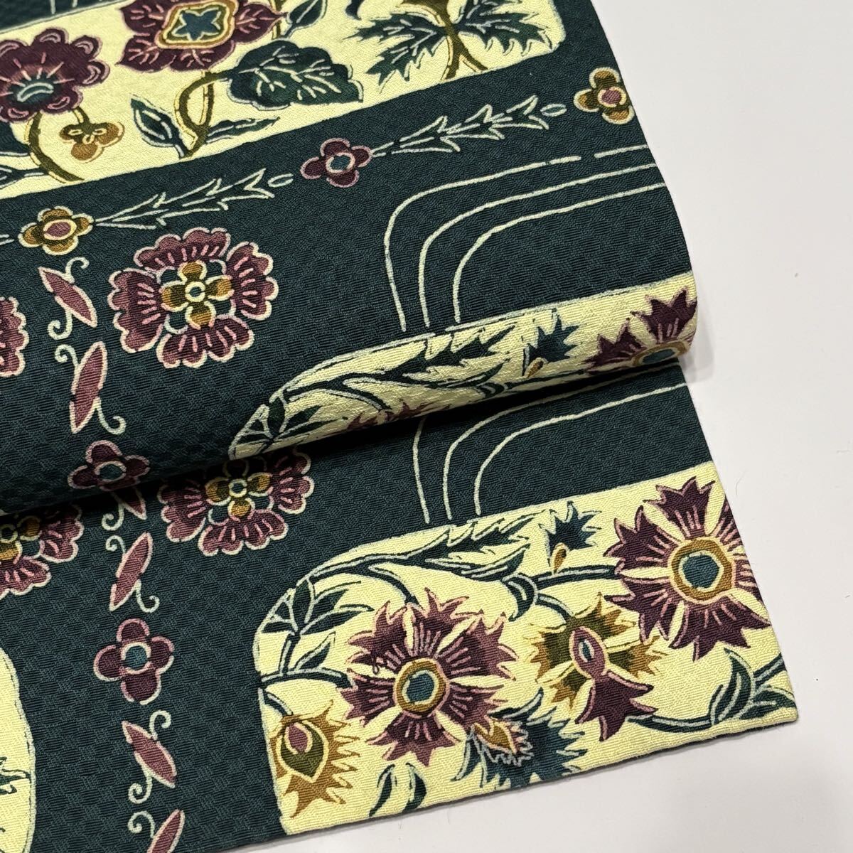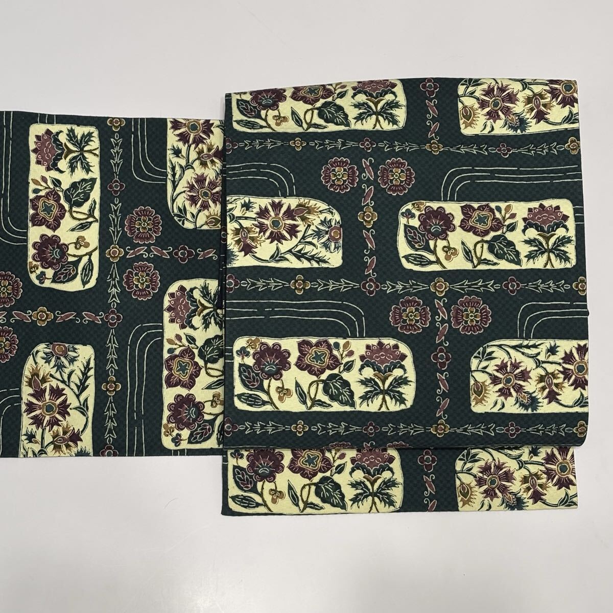 ダークグリーン地に花柄模様があしらわれた、レトロで可愛らしい印象の京袋帯です。