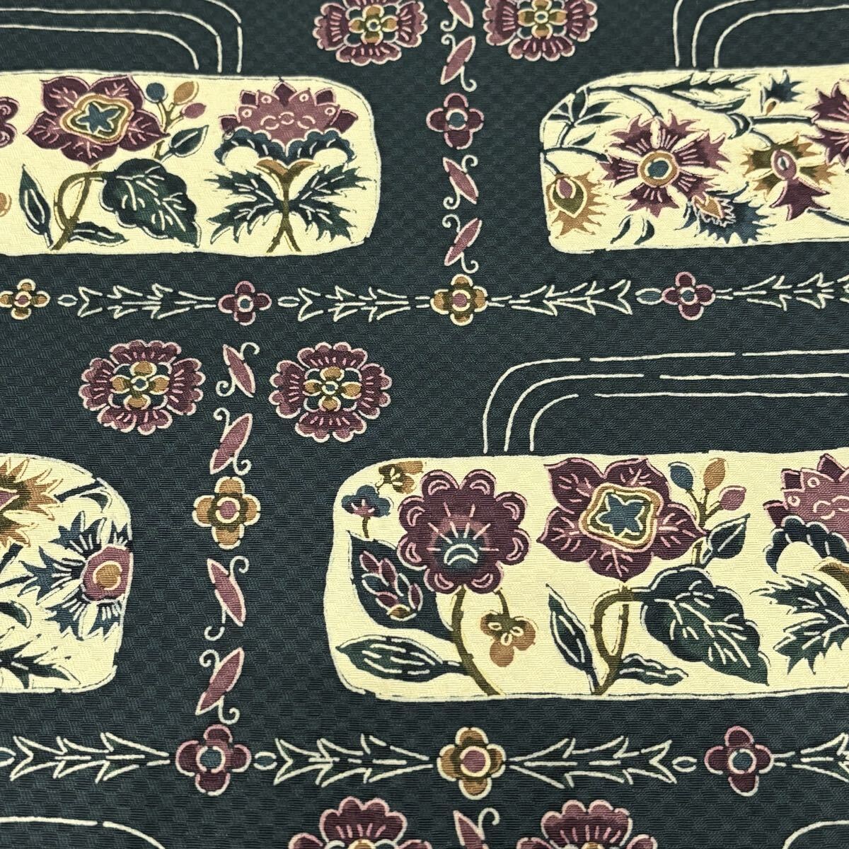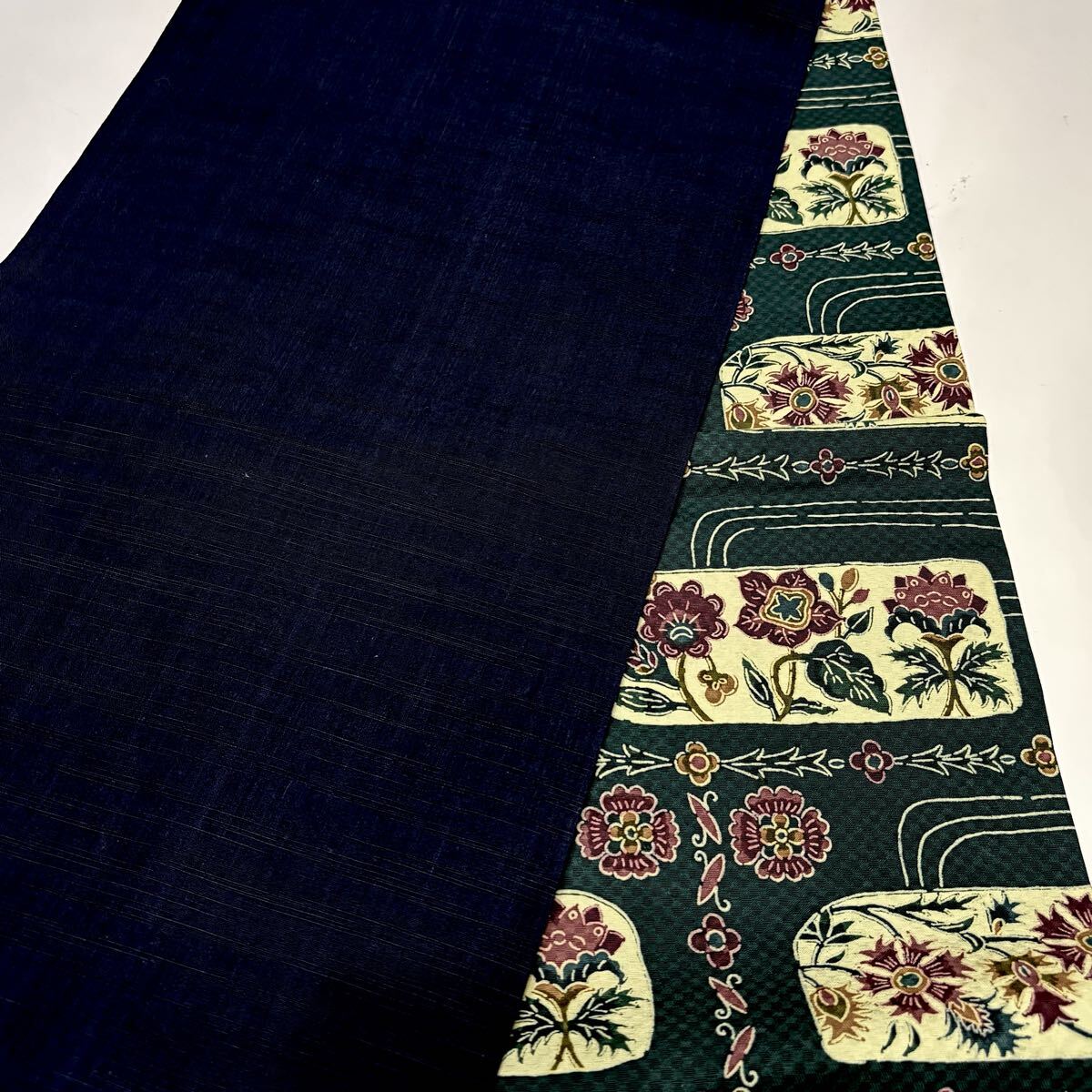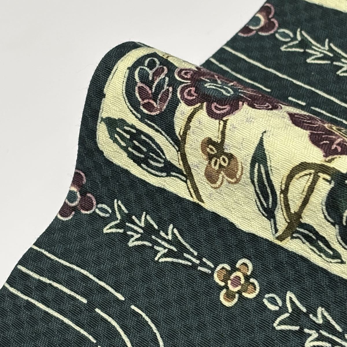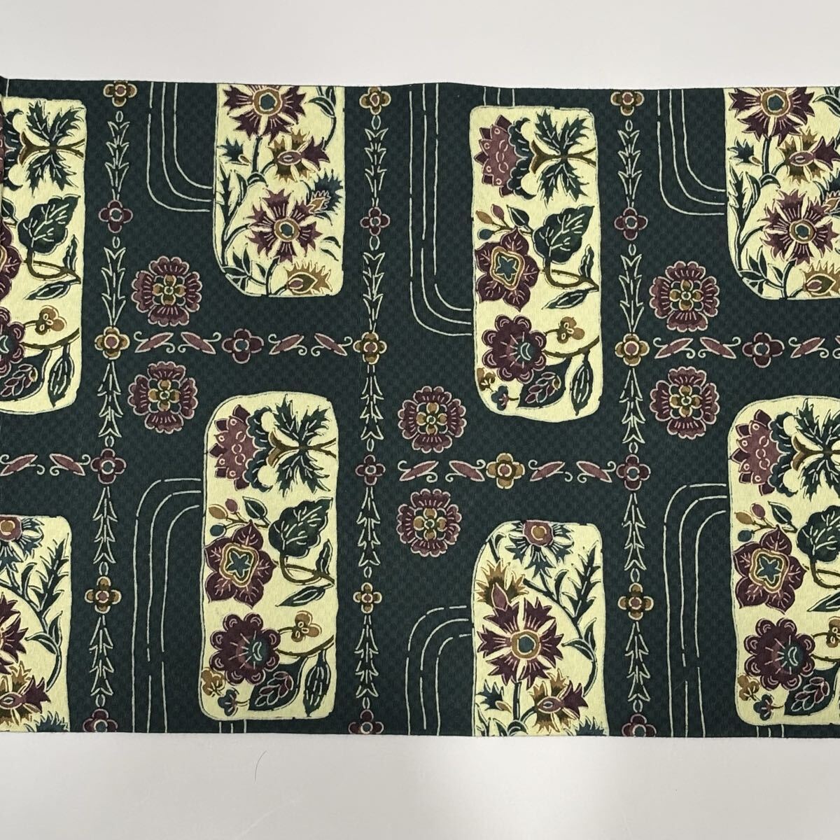 ダークグリーン地に花柄模様があしらわれた、レトロで可愛らしい印象の京袋帯です。