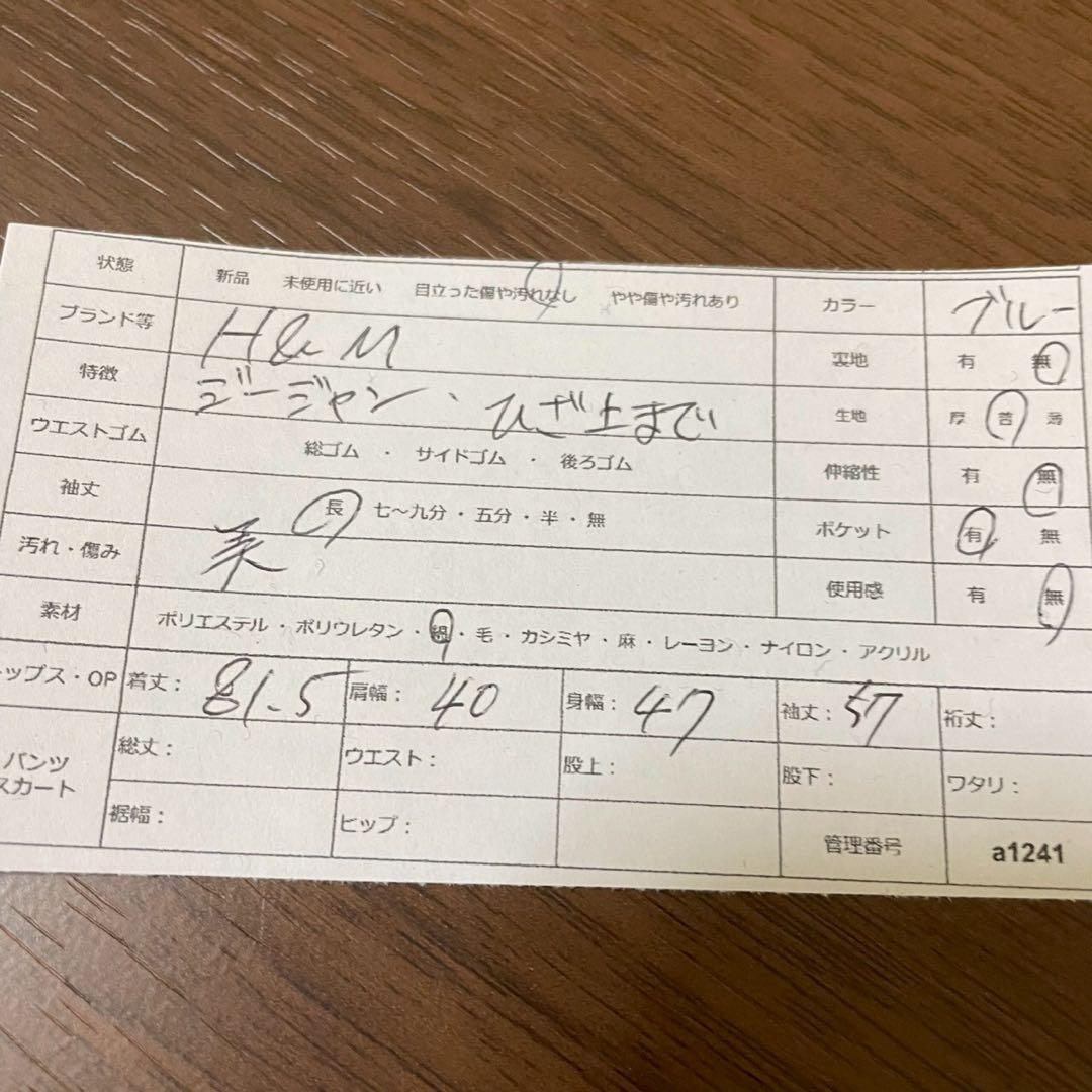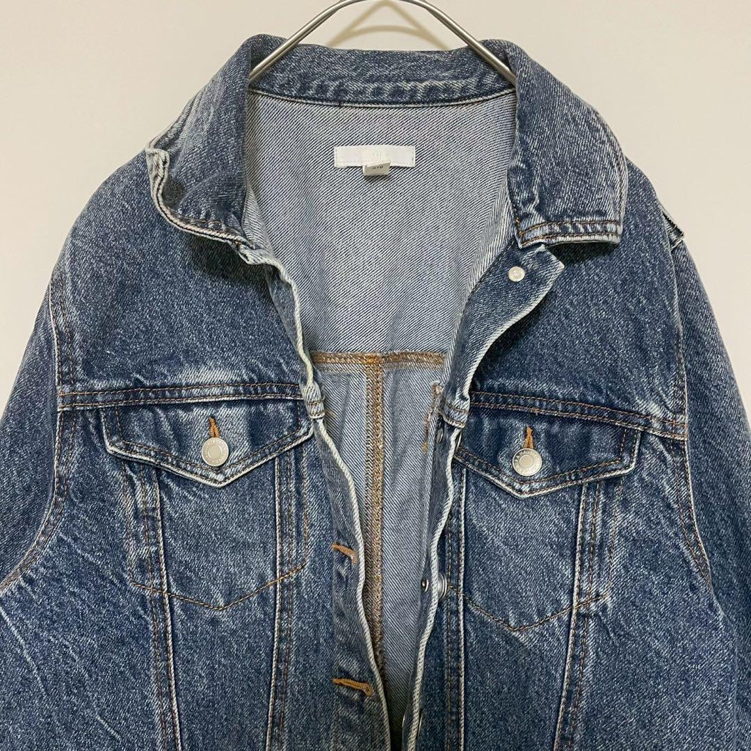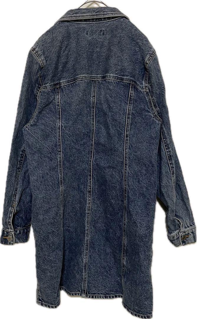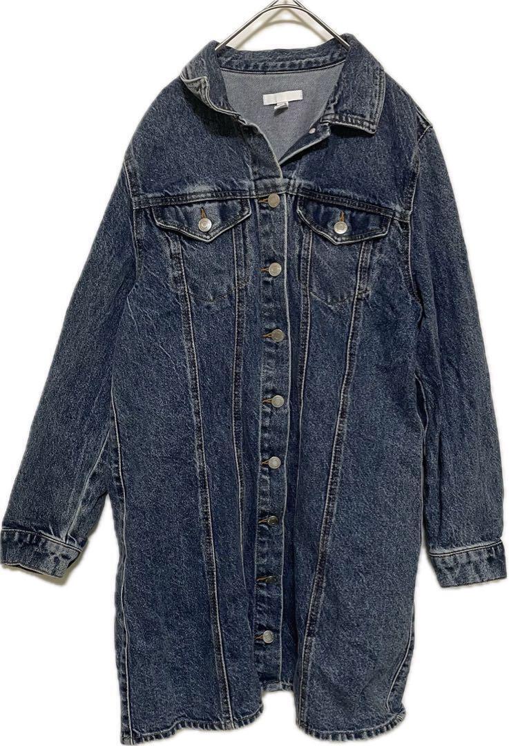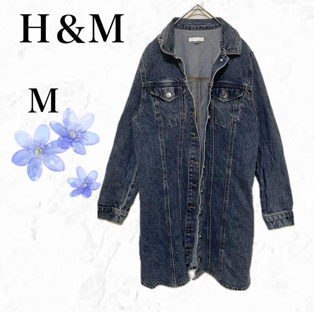 ダークブルーのH&Mデニムジャケット、Mサイズ、シンプルでスタイリッシュなデザイン。カバーオール 膝上ぐらいまでの長さ