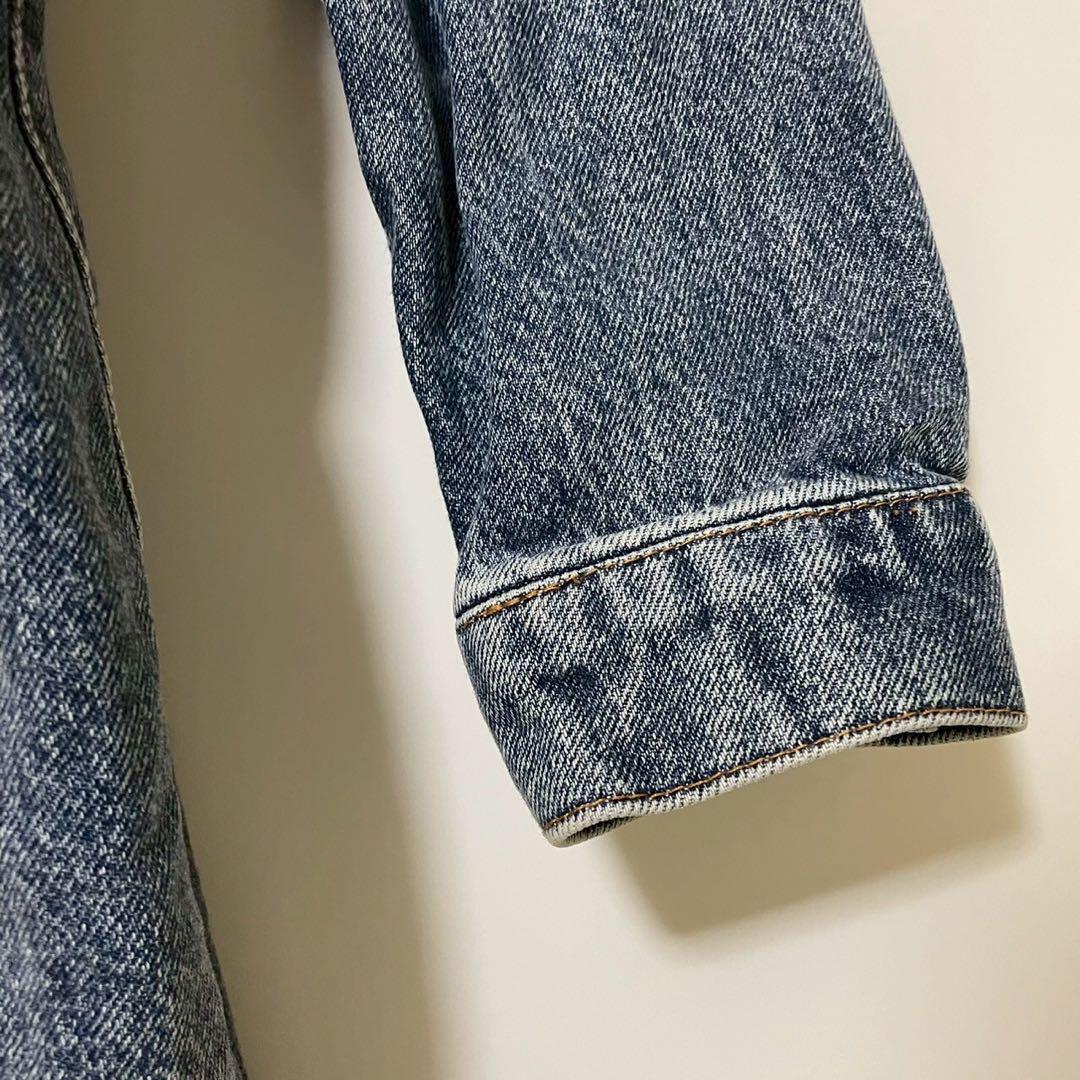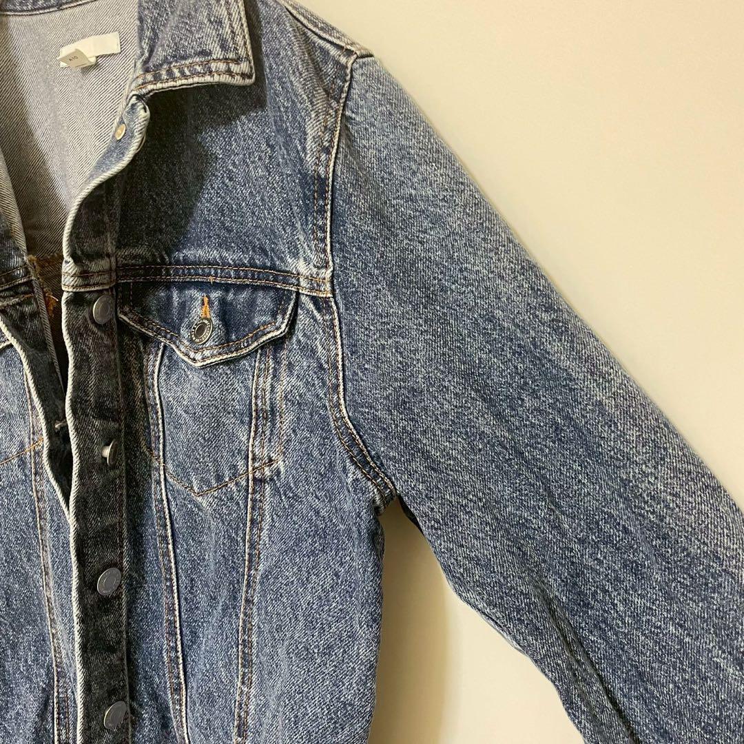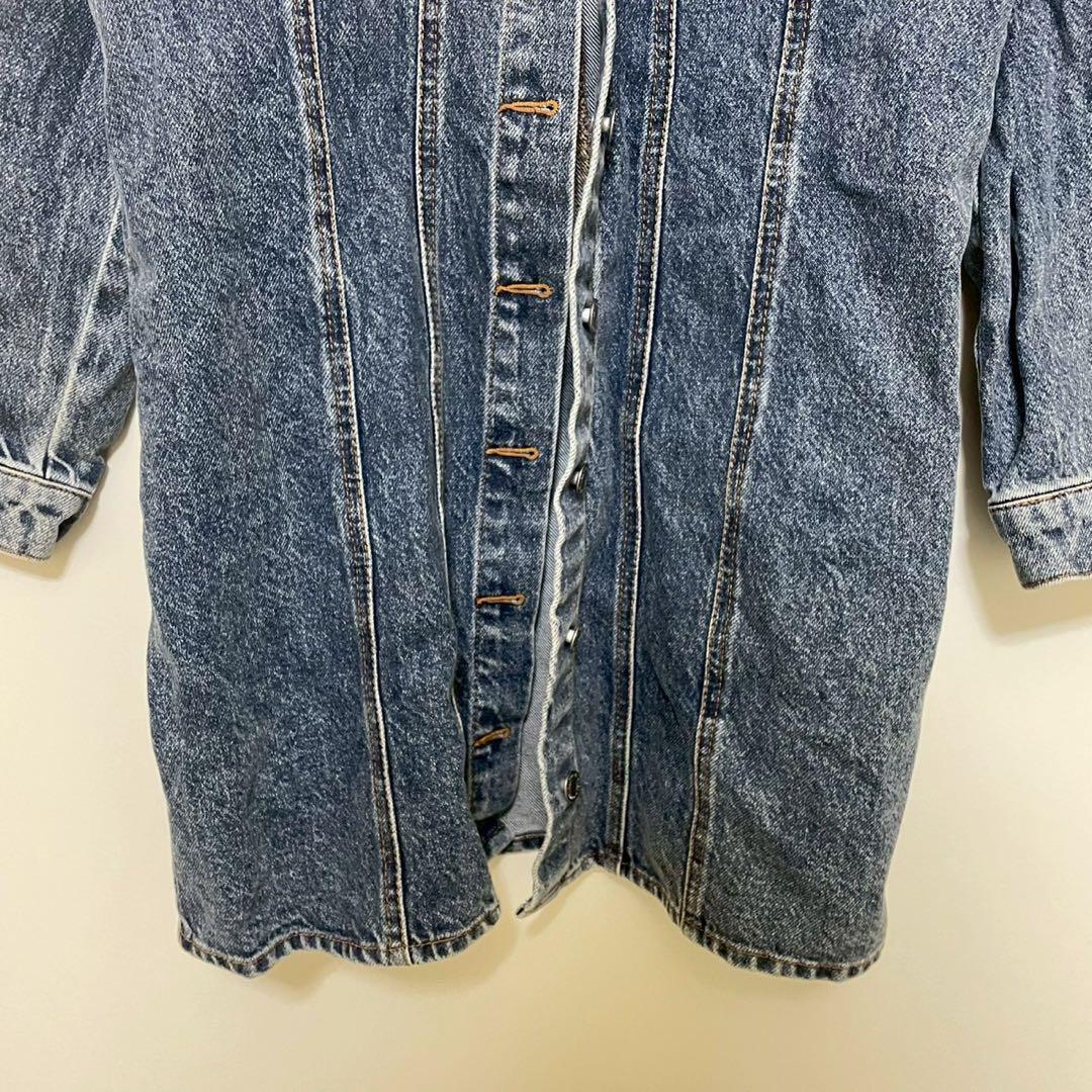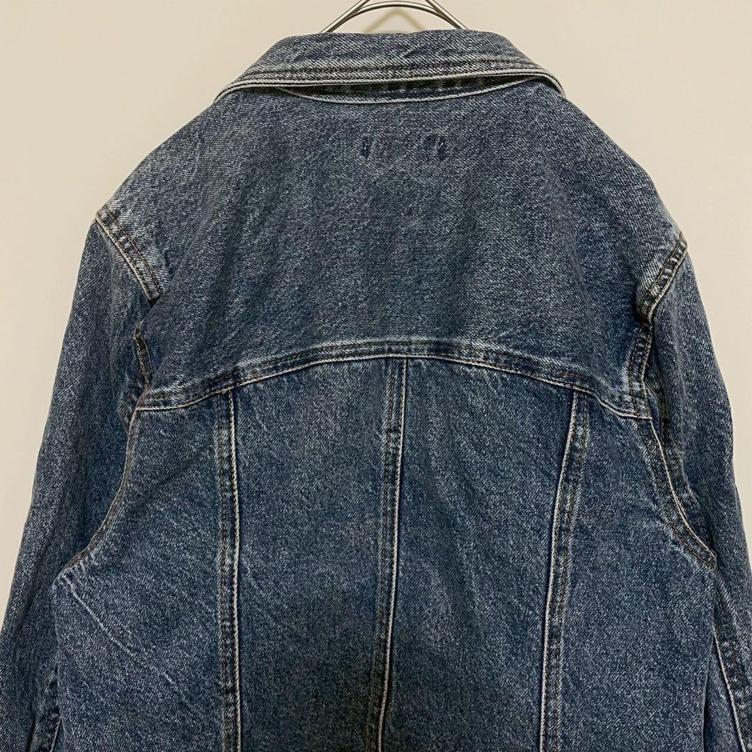 ダークブルーのH&Mデニムジャケット、Mサイズ、シンプルでスタイリッシュなデザイン。カバーオール 膝上ぐらいまでの長さ