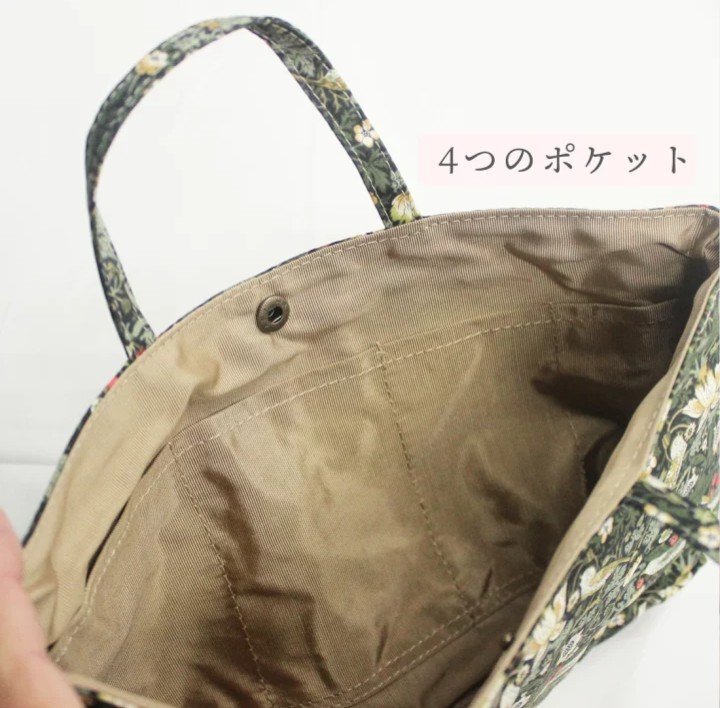 | 商品説明 | LIBERTY FABRICSを使ったバッグインバッグです サイズはヨコ27 x 高さ15cmの通勤通学バッグに入れるのに適度な大きさですよ。 マチは5cmでスリムな形状ですが,外側に2つ,内側に4つのポケットが付いています。 内側中央部にはファスナー付きのポケットが付いています。 定期券や携帯,貴重品などをしっかりと分けられますよ。 サイズ : 約27 x 5 x 15cm 素材 表 リバティプリント 綿100% 内側 ナイロン100% バッグインバッグ |